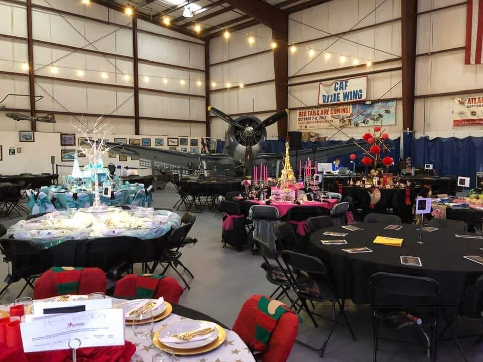 Our hangar is over 10,000 square feet and provides you with a blank canvas to create your perfect space with accommodation for up to 400+ guests. We’re are located at Atlanta Regional Airport, giving your guests a one-of-a-kind indoor/outdoor experience with front row views of the runway. We can also offer you and your guests warbird rides and other services… Great for weddings, small concerts, shows, movie nights, corporate parties, holiday parties, birthdays, and more.