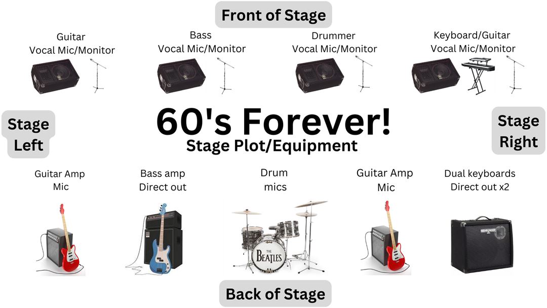 60's Forever! is a tribute to the sounds of the 1960's, including the songs of the British Invasion, Summer of Love, Surf Music and bands who produced the unique sound of 1960's Rock and Roll