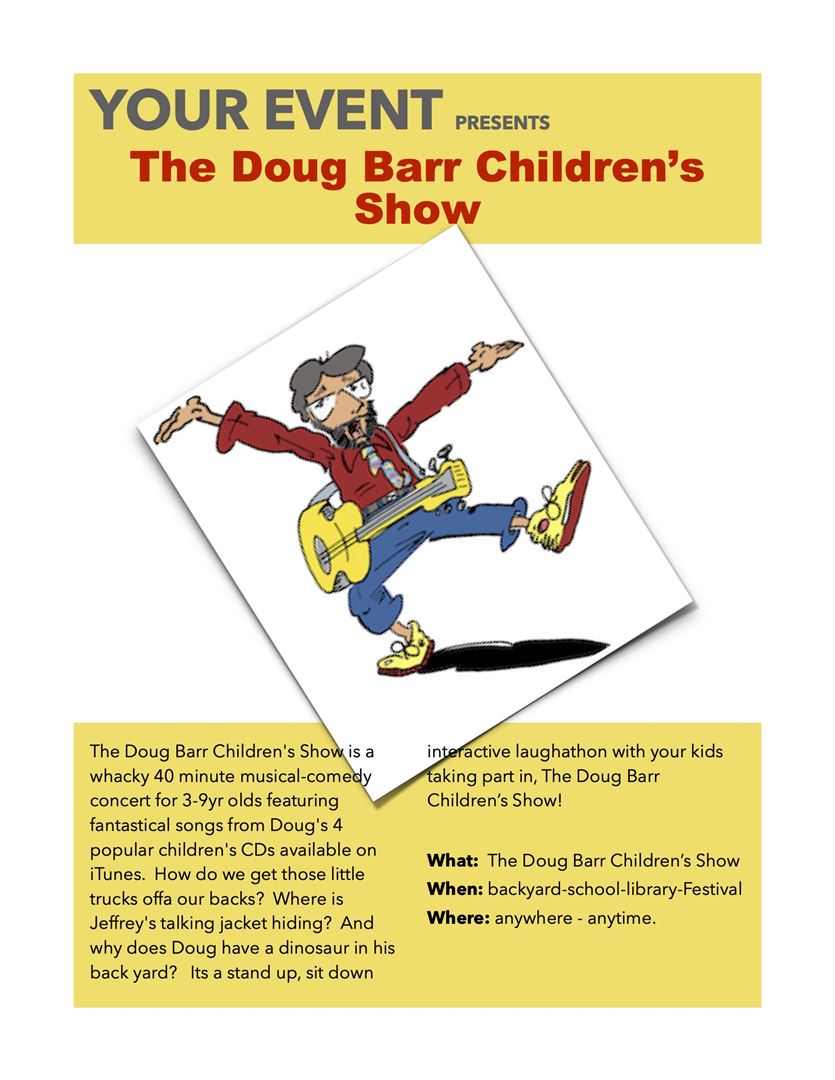 The Doug Barr Children's Show is a whacky 40 minute musical-comedy concert for 3-9yr olds featuring fantastical songs from Doug's 4 popular children's CDs available on iTunes. How do we get those little trucks offa our backs? Where is Jeffrey's talking jacket hiding? And why does Doug have a dinosaur in his back yard? Its a stand up, sit down interactive laughathon with your kids taking part in, The Doug Barr Children’s Show!