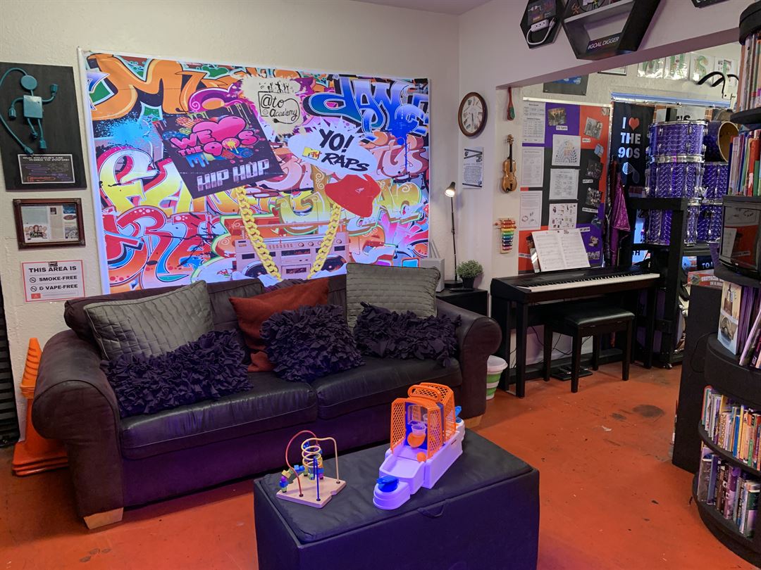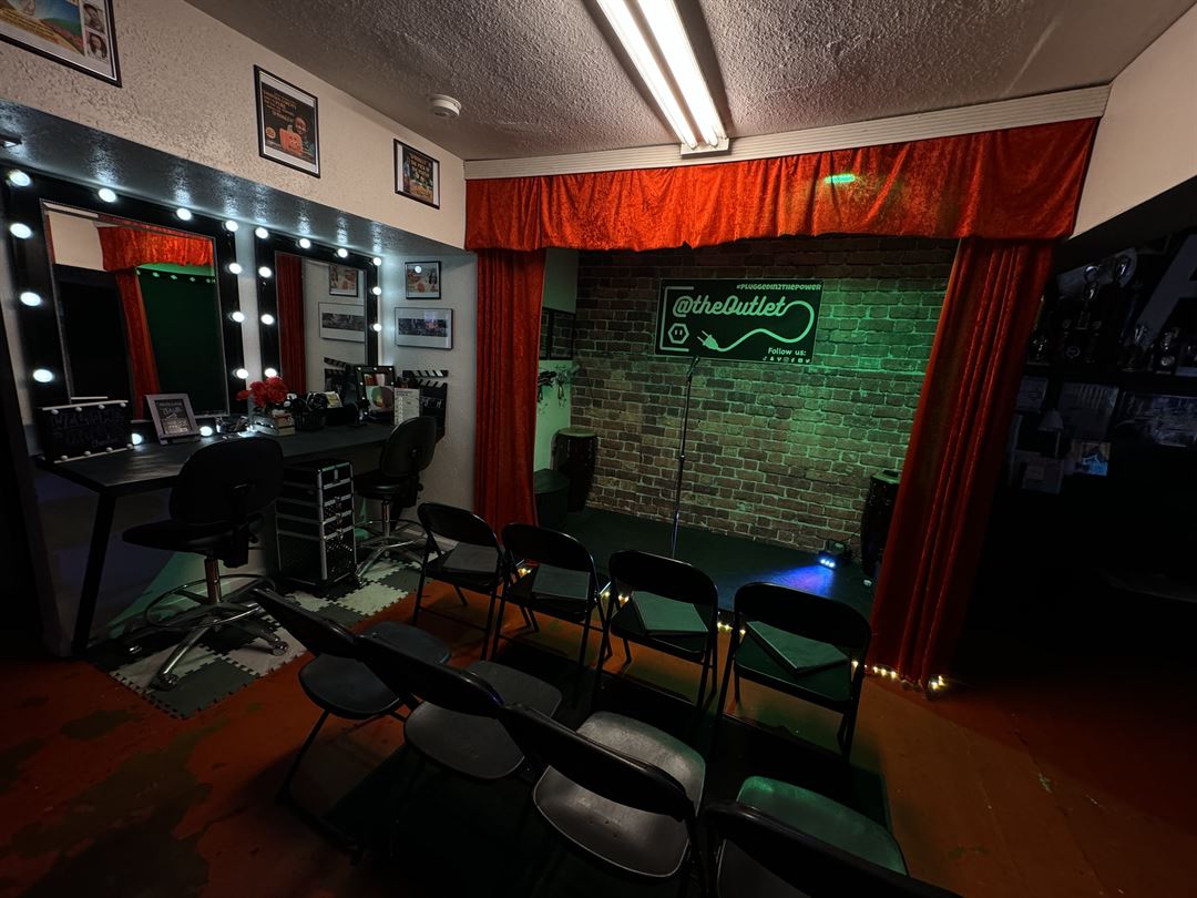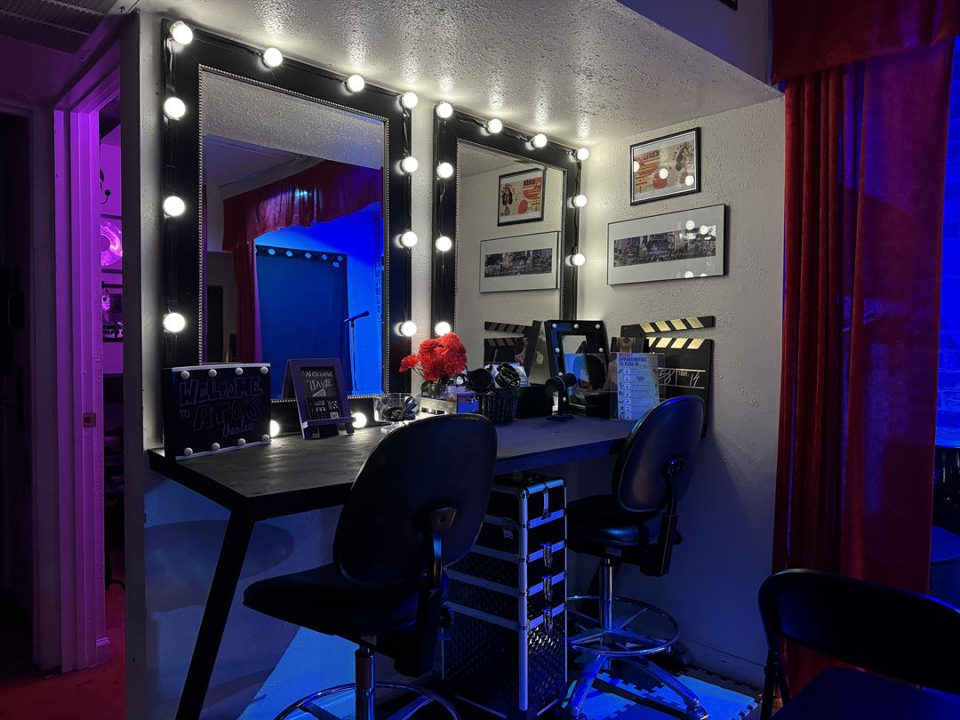 We have multipurpose space, a lounge area, and outdoor patio, and an art, a/v, and dance studio. We also have a small stage equipped with a sound system, stage lights, retractable automated curtains, and a smoke machine. Our space is designed to adapt to your needs, whether you're hosting a small private party, a table read, a special occasion event, or even a themed gathering.