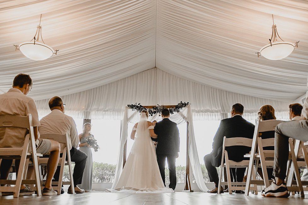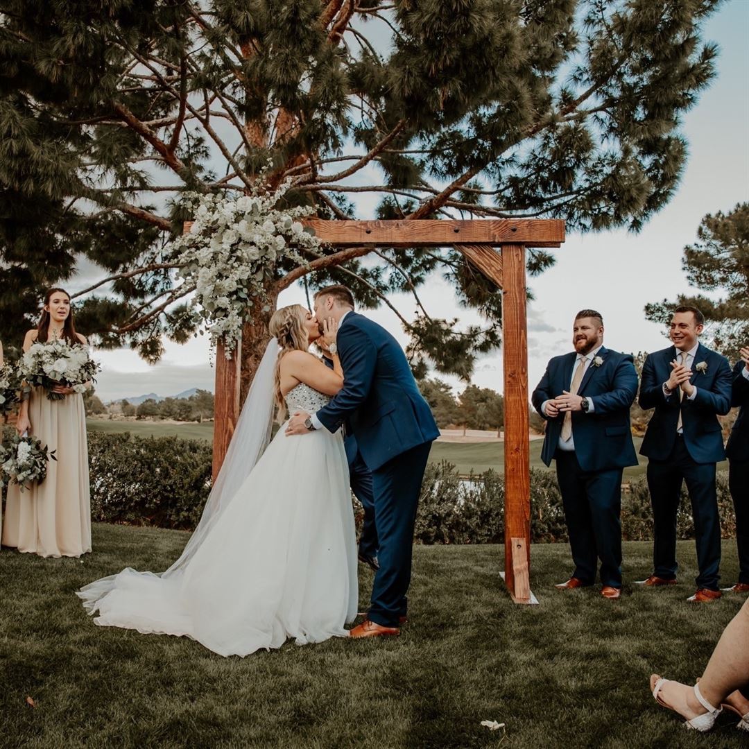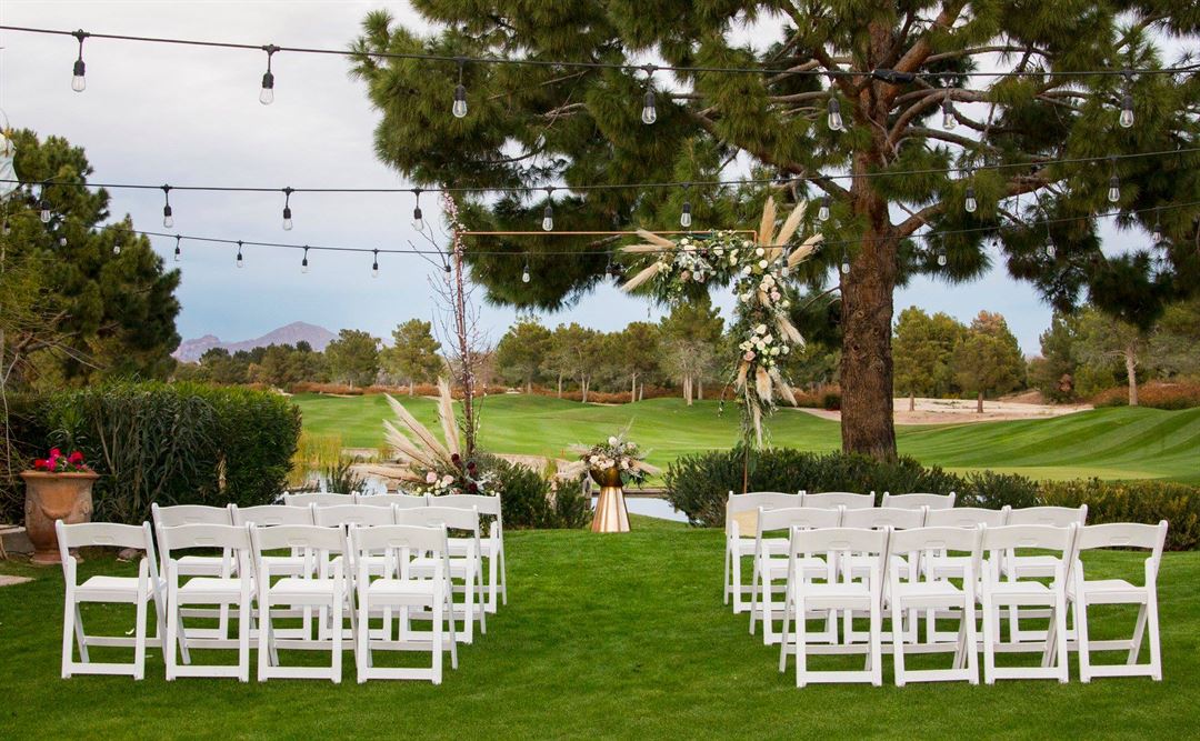 Raven Golf Club Phoenix's 3,600 square-foot, climate-controlled event pavilion overlooking the scenic 18th hole with its beautiful lake and waterfall serve as a stunning backdrop for wedding receptions, bridal party functions, corporate meetings, holiday parties, quinceaneras, bar/bat mitzvahs, sweet 16 parties, and other special occasions. The venue features a draped white ceiling, floor-to-ceiling windows with breathtaking vistas, and upscale furnishings, with seating for up to 175 guests.
