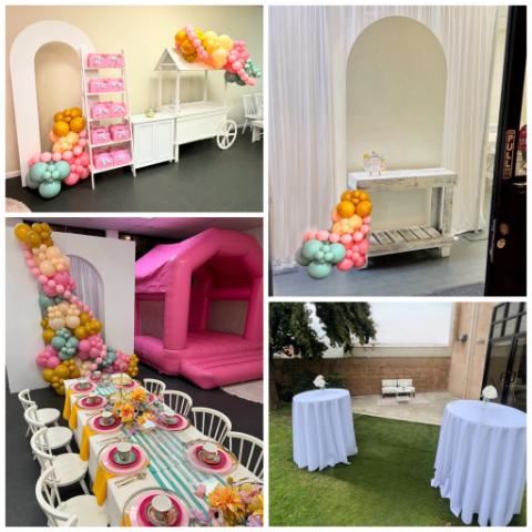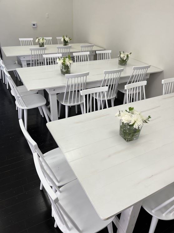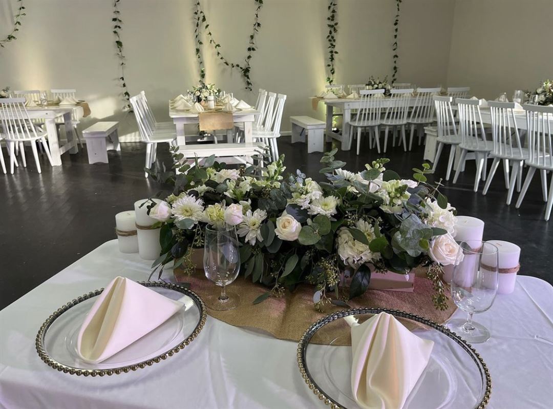 Our color palette has warm neutral tones that allows you the freedom to decorate to any theme. We have 5 custom built farmhouse tables with seating. Total table seating is 60 adults & 16 children. We also have outdoor lounge. There is open space for the addition of rentals. We have a built in hedge wall that is perfect for backdrop set ups.