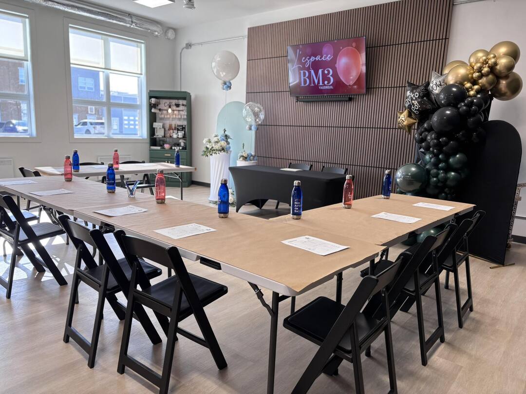 Welcome to L'espace BM3 Vaudreuil – Your Premier Event Planning Destination! L'espace BM3 Vaudreuil, is a modern, trendy venue that can comfortably host up to 50 guests. Perfect for corporate luncheons, team meetings, and small professional events. The space includes a small kitchen with a fridge, tables, chairs, and a screen for presentations.