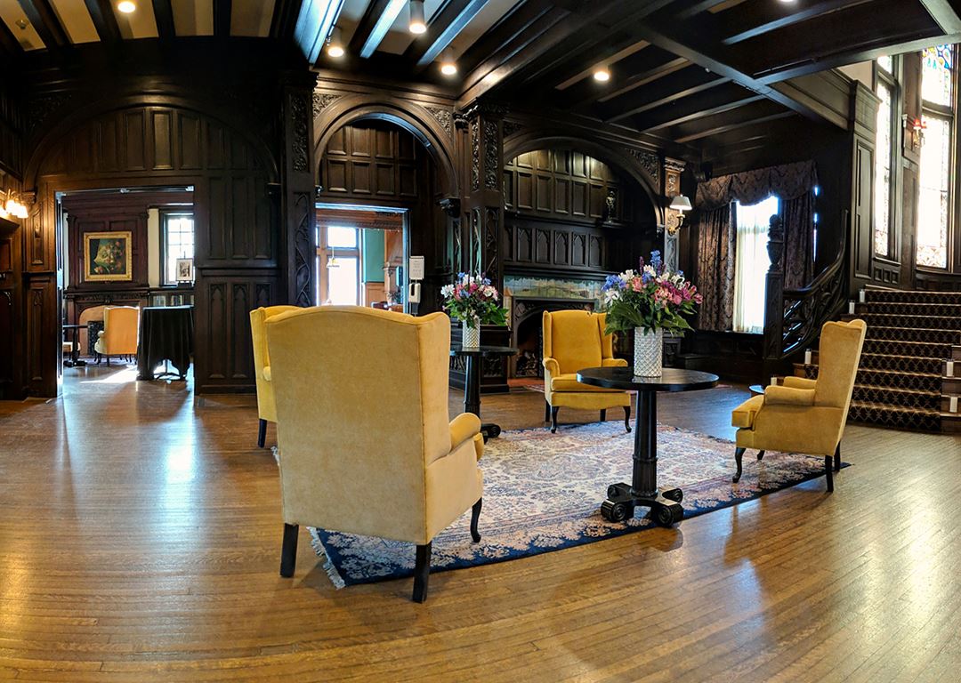 With its soaring walnut beamed ceiling, intricate woodwork, and massive leaded and stained glass windows, the Mansions’ Grand Hall is like no place in Pittsburgh, or, in fact, in the world. It’s a one-of-a-kind space which transports you back to an elegant time!