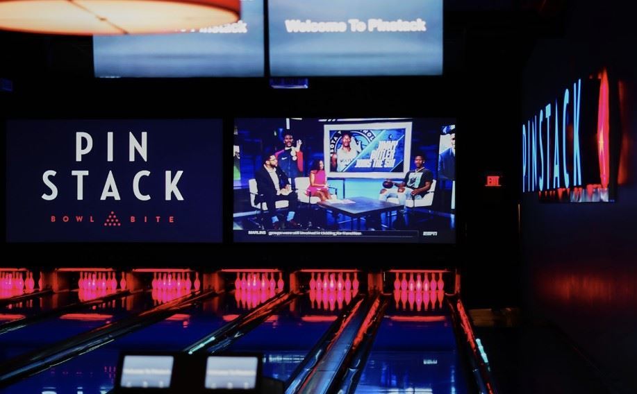 PINSTACK is a premier entertainment destination featuring a restaurant, full-sized bowling lanes, private lanes available to book for events and an array of indoor games and attractions.