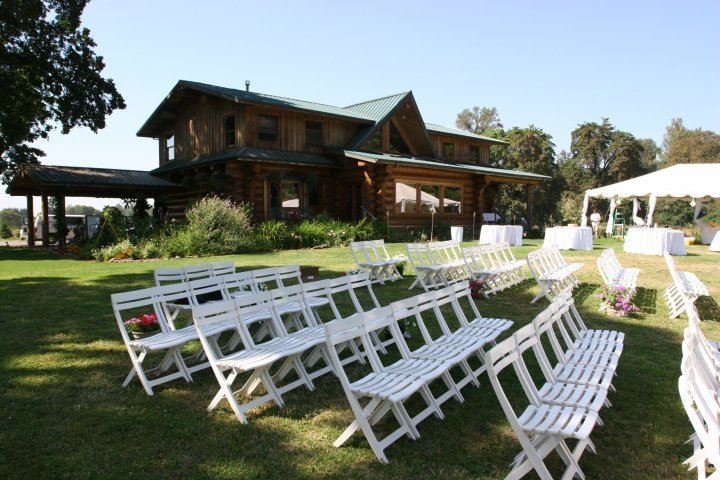 Beautiful landscaping and amazing views of the Willamette river welcome you and up to 500 of your guests for an unforgettable wedding experience. Our large log home is available to the Wedding party for preparations, while guests can mingle on the expansive decks and lush green lawn. We have several large white tents with lights and tulle accents for an elegant reception, catered by your chosen provider.