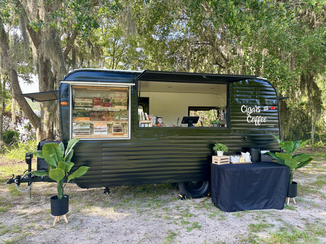 Mobile trailer that serves barista style coffee, cigars, and Italian biscotti.