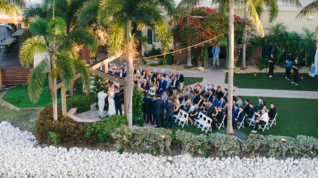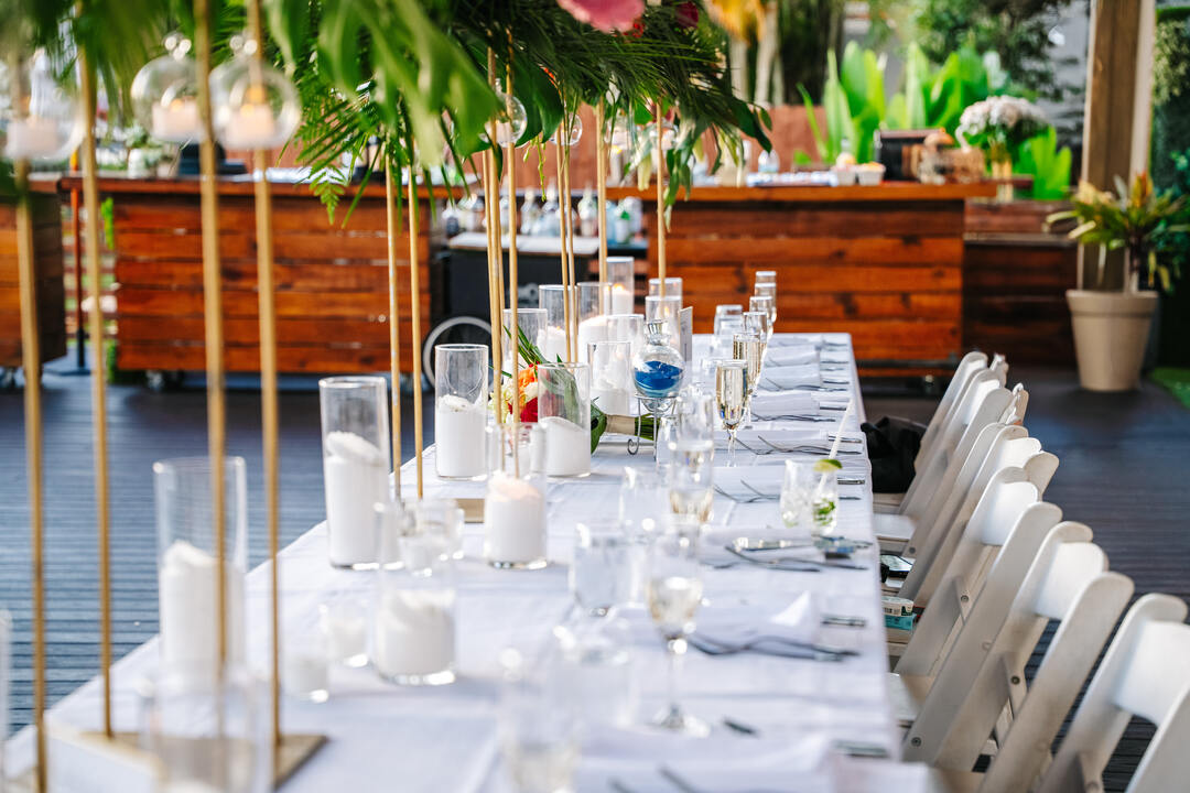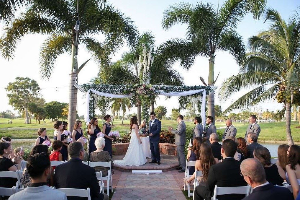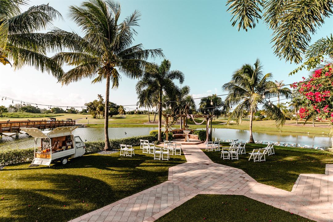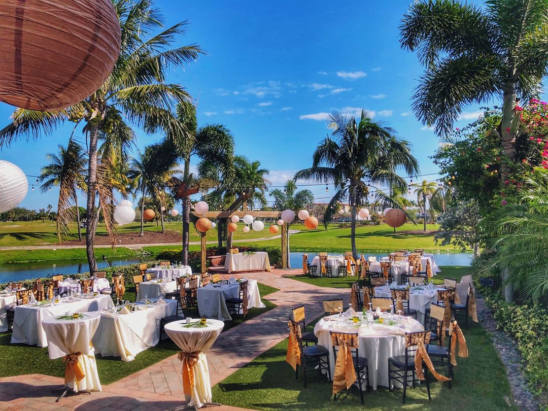 You will love the views from our range of indoor and outdoor spaces, which include private and semi-private options with stunning vistas of rolling golf course hills, bridges, lakes, gardens, and breathtaking sunsets. Our private terrace provides an ideal setting for your wedding ceremony, featuring a handcrafted wooden arch and a picturesque backdrop of the golf course and its lakes.