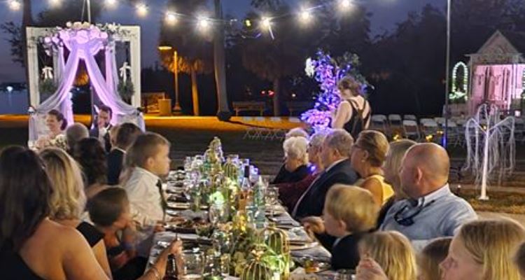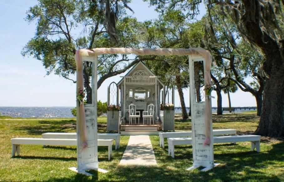 The chapel is 21 feet long and absolutely charming. Most couples have chosen to marry on the front porch of the chapel, so all of their guests can enjoy the ceremony. The chapel is decorated inside and out to your vibe and color scheme. No two weddings are alike!