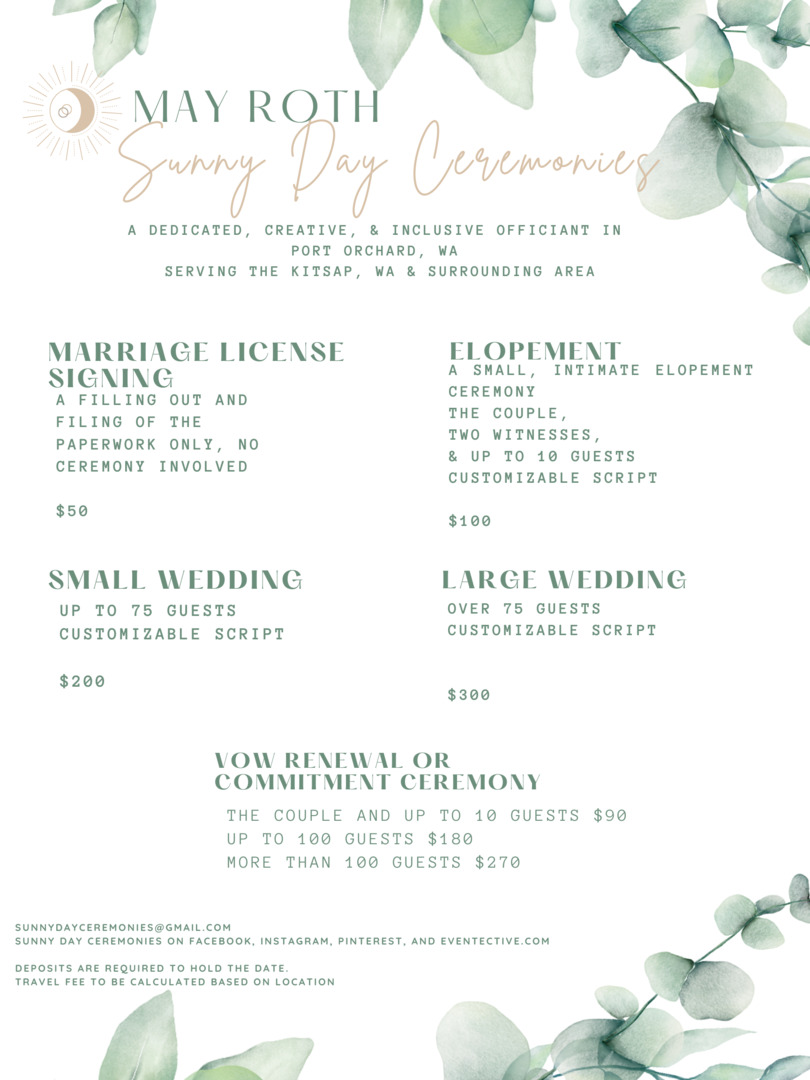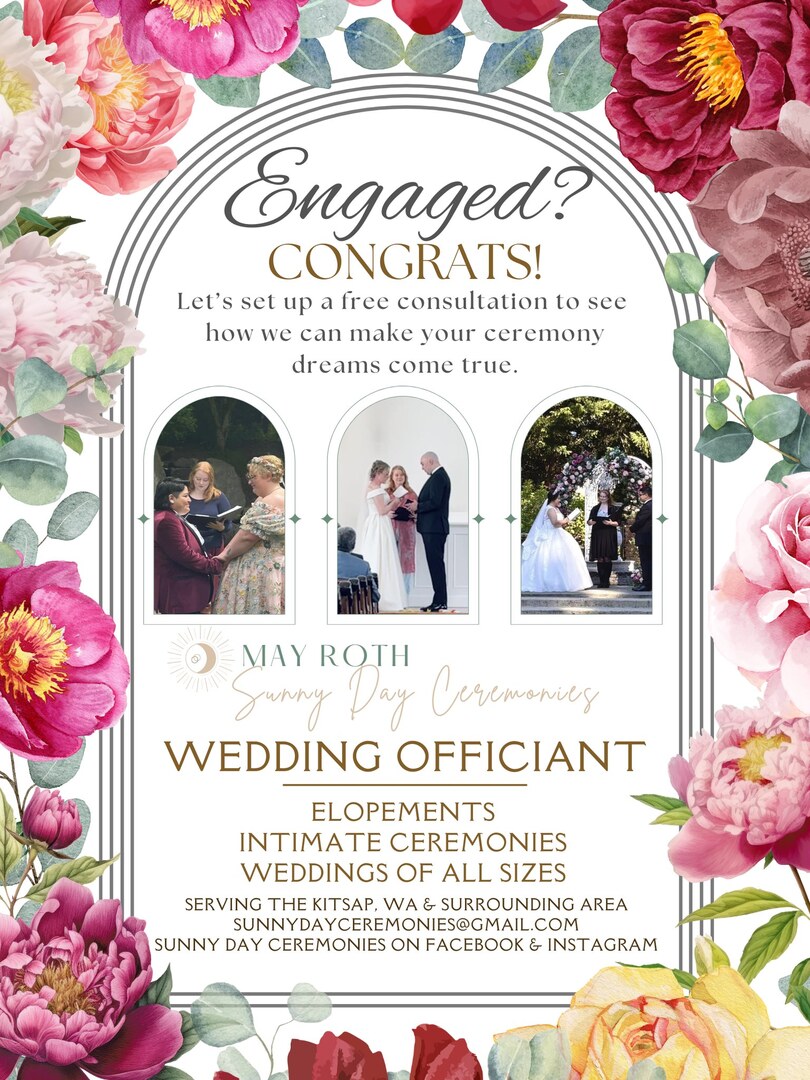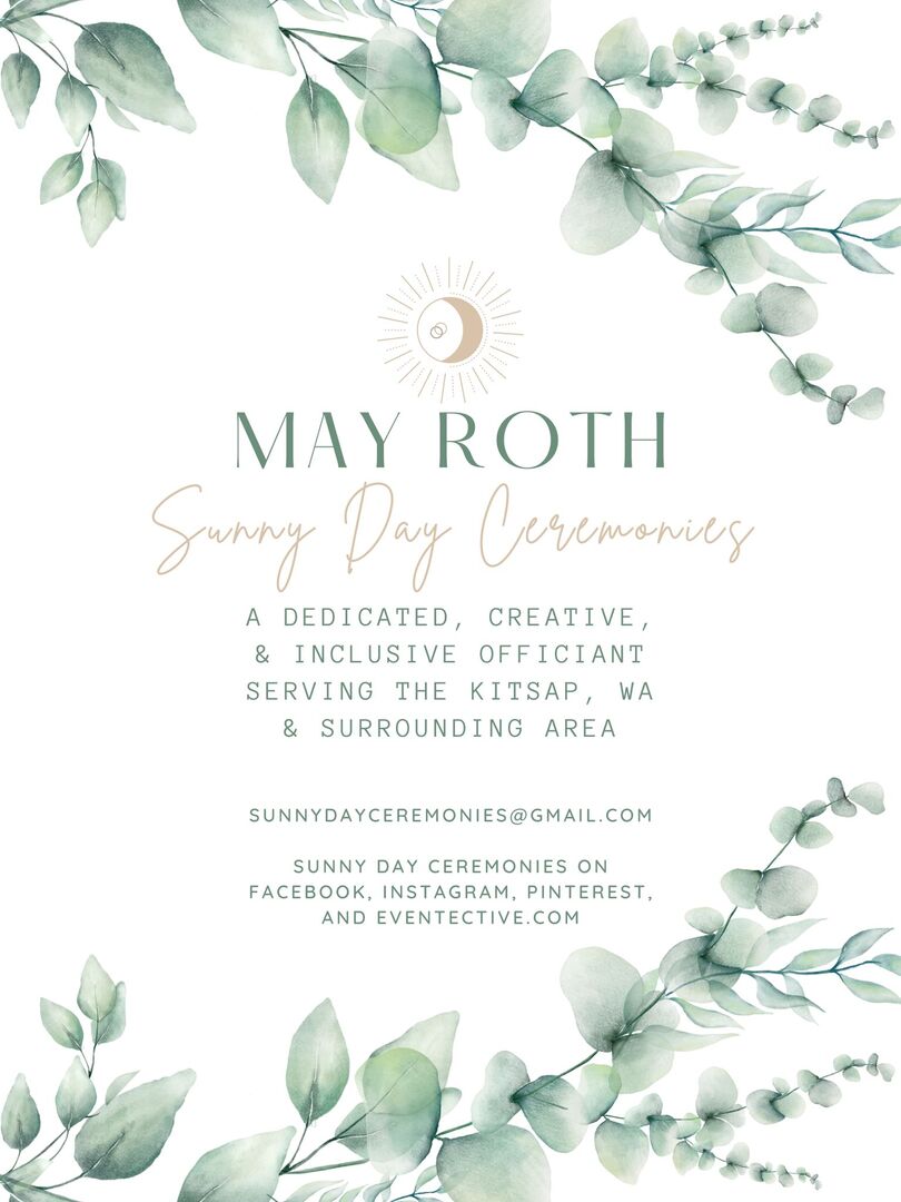 My name is May and I am a dedicated, creative, & inclusive wedding officiant serving the Kitsap Peninsula and Puget Sound Area!