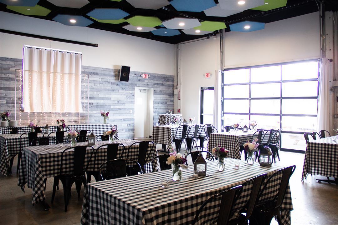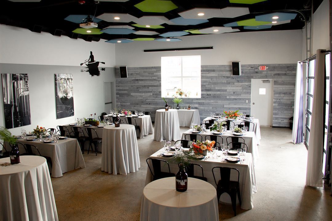 The East Room is the perfect spot to host corporate functions, birthday parties, and more, capitalizing on the industrial charm with warm, rustic accents. The natural pairing of fresh beer and any excuse to have a celebration with friends and family gave way to this brewery event space. Featuring large garage doors that open to a spacious tented patio that complements the rustic touches of the interior's large barn door and barn board accent wall.