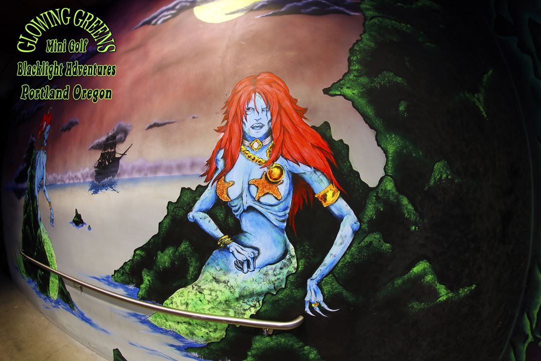 Glowing Greens: Blacklight Adventure is the product of our love for wild and vividly surreal artwork and the fun of miniature golf. We have brought them together indoors, using Ultraviolet paints and blacklights to create an unbelievable environment of three dimensional realism. Our Island of Adventure will capture the imaginations of everyone and immerse you in a world of animated creatures and stimulating sound effects.