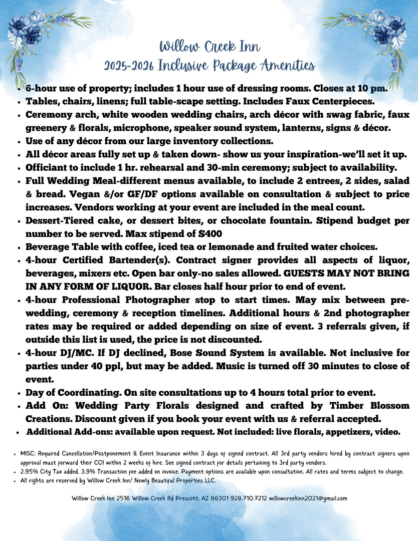 The Willow Creek Inn, a premier wedding venue nestled in the heart of Prescott, Arizona. At Willow Creek Inn, we believe that your wedding day is one of the most momentous occasions of your life, and we are dedicated to making it an unforgettable experience. Our venue combines timeless elegance with natural beauty, offering a picturesque setting that will leave a lasting impression on you and your guests.
