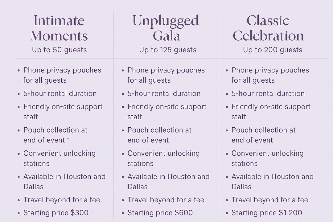 Looking to keep your event private, intentional, and truly unforgettable? In The Moment provides stylish phone privacy pouch rentals to create distraction-free experiences at weddings, galas, and intimate gatherings.