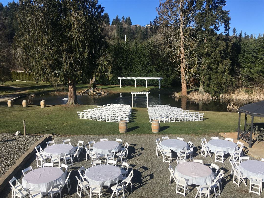 Majestic mountains, mature trees and sprawling lawn framed by a spring-fed pond with a serene fountain and soothing waterfall create a stunning backdrop to your event. Our lush 5 acre property can accommodate up to 250 guests and boasts Bride and Groom cottages, a large drapery-covered tent, two decorative arbors, a covered wrought-iron gazebo with bistro lighting, a staging kitchen and beverage service area, spacious patio/dance floor area for a DJ, complimentary parking with attendant, on-site ADA bathrooms, and more!