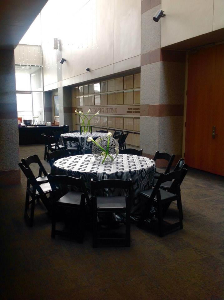 Large receptions are held in the lobby, a space that accommodates 300 guests for a reception and 200 for a sit-down dinner. With room for a band and a dance floor, the lobby lets guests enjoy music and dancing throughout the evening. Festivities can last until midnight. With a seating capacity of 307 and state-of-the-art audiovisual equipment, Daniels Auditorium is the ideal setting for large meetings and performances. The Demonstration Gallery is a smaller space with a unique setting, perfect for small meetings, lunches, and receptions. Encased by three glass walls, the "Glass Box" has a wonderful view overlooking Bicentennial Plaza and the Legislative Building.