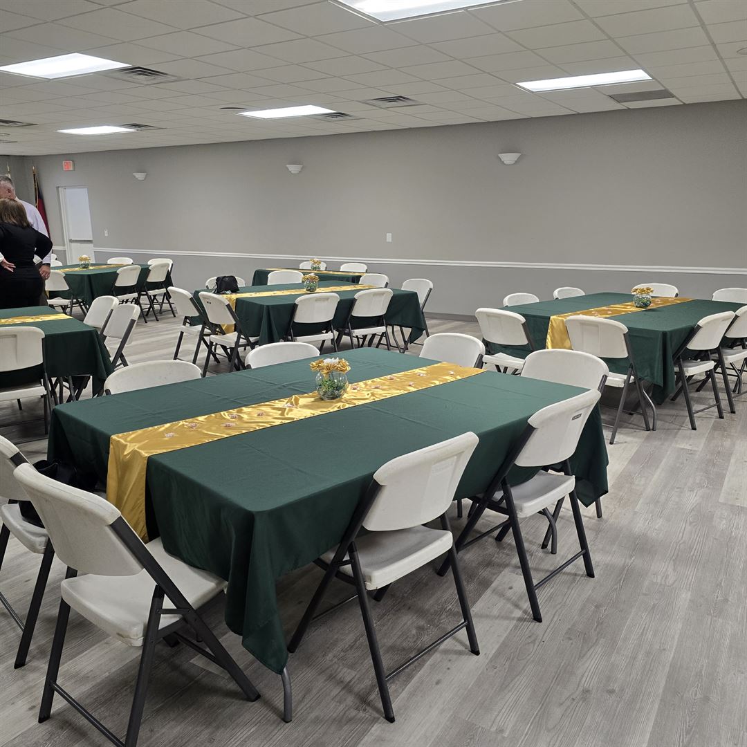 Our event center is located on approximately 30 acres, located near Highway 64 and New Hope Road. We offer a banquet hall, prep kitchen, a picnic pavilion, beautiful pond, lighted volleyball courts, picnic area, baseball/softball field, a lounge serving beer and wine, and plenty of parking for your event.