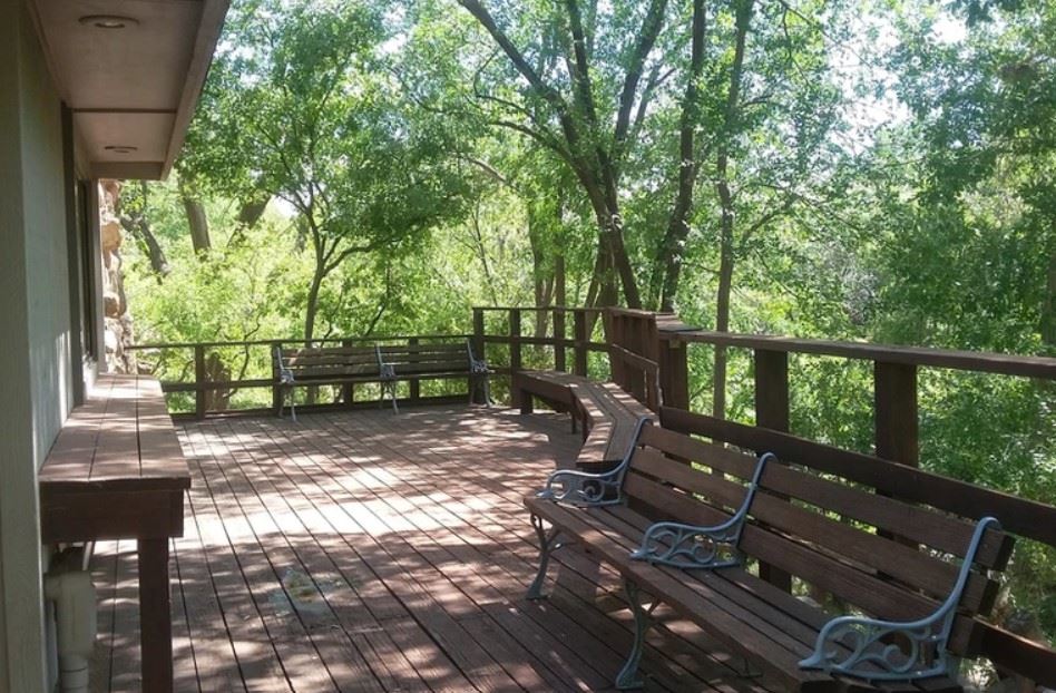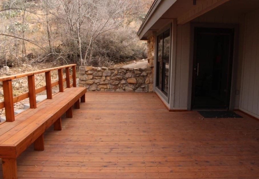 The Chapel consists of three main rooms: the sanctuary, the parlor, and kitchen area. The sanctuary has a large floor to ceiling lancet arch window, which is surrounded (bordered) with natural stone and looks out to the fountain in the courtyard. The parlor area is adjacent to the rear of the sanctuary and has a couch, 2 chairs, and an adjustable round table. The outside court area has a water fountain and decking that overlooks beautiful views of the spring fed pond and natural fauna of the box canyon.