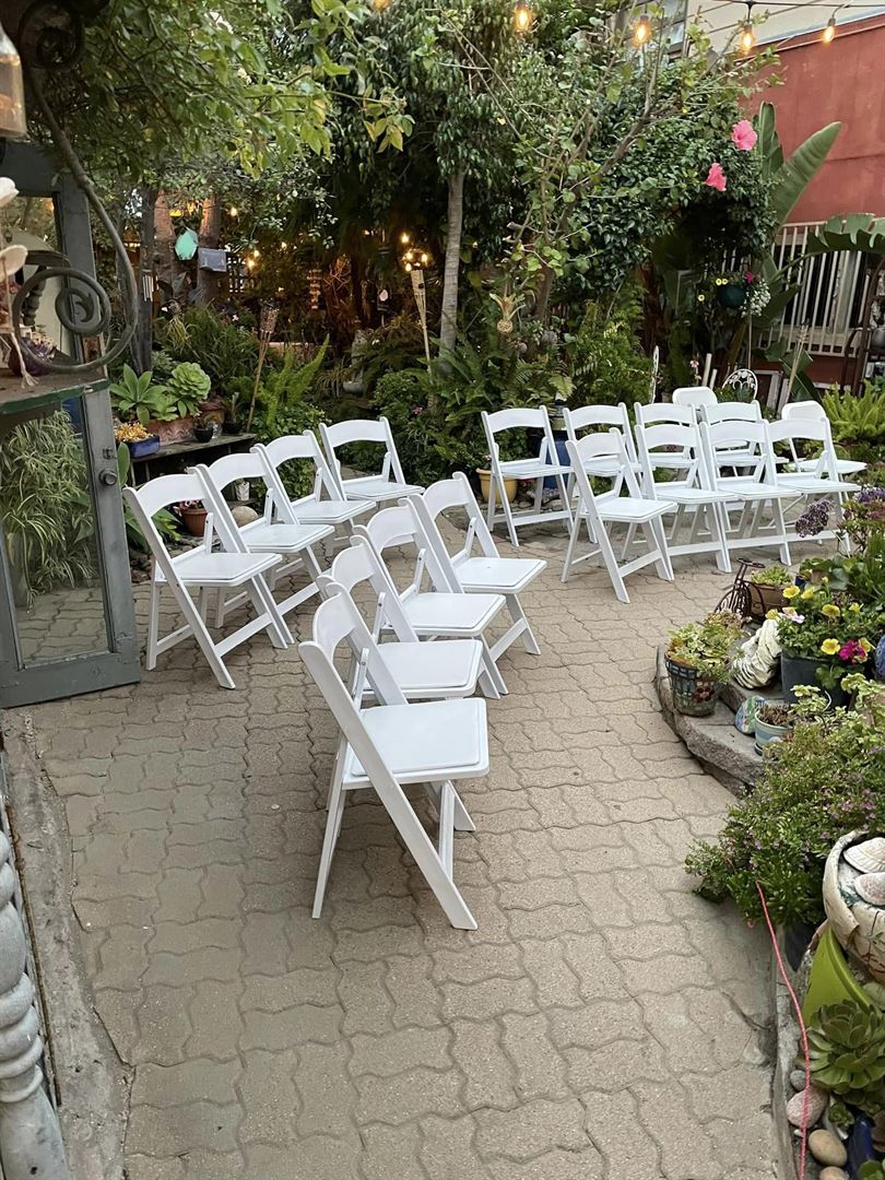 We can arrange complete catering through one of our preferred vendors or you can keep it simple and just bring appetizers. If all you need is tables and chairs we can arrange to have them delivered as well. We can sit up to 45 people for catered dining. The garden will be beautifully lit with all the wonderful fountains running. Lush and green, beautiful plants and flowers are arranged to entice and sooth the soul.