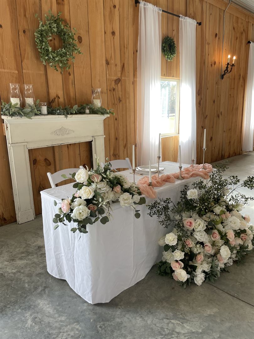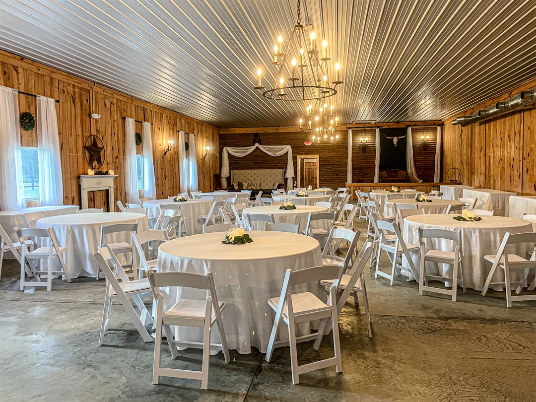 The property consists of a large barn situated on 80 acres of land which provides ample space for an indoor or outdoor wedding. The barn can hold 300 people and table seating is provided for up to 80 people. It features large windows that allow ample natural light to stream into the main room with over 3200 square feet of available space, a handicap accessible men and women’s wash closet, a built-in stage, a bar, and space for a dance floor. The open room allows for the bride to customize the configuration to her ideal vision for her Big Day!
