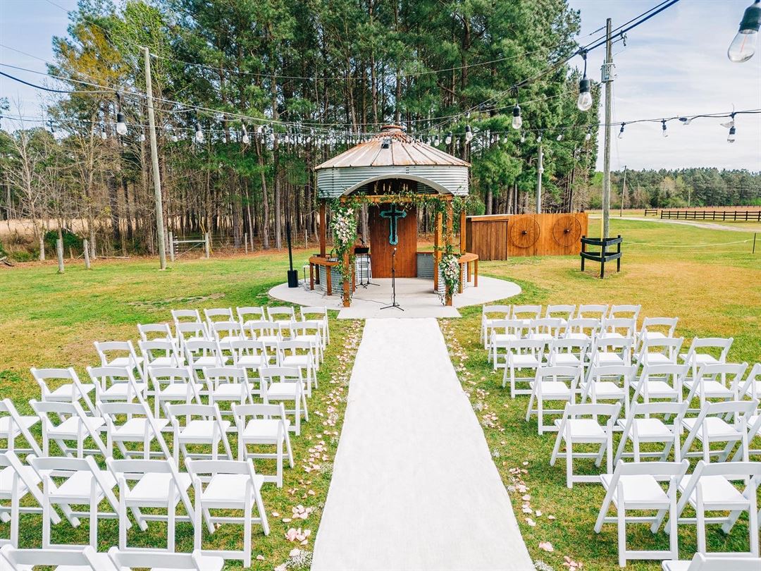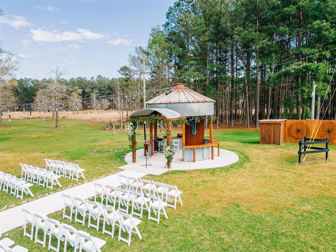 The outside property encompasses a pond, oak trees, a grain bin gazebo, and sprawling fields, any of which can be used for an outside ceremony, cocktail hour, or reception. The outdoor area has additional space to increase the occupancy capacity. The property also includes a bridal suite for the bridal party to use prior to the ceremony. The combined natural beauty and rustic charm make this an ideal location for your dream wedding.