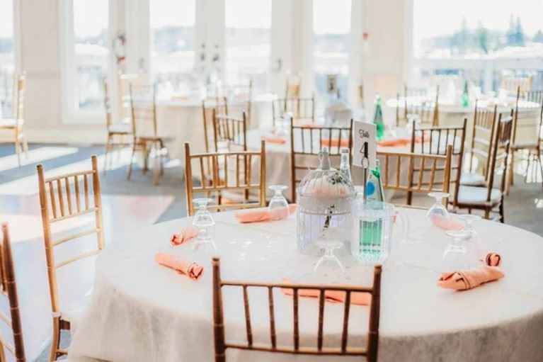 Our dining room, with cathedral ceiling & fireplace, can comfortably seat 200 people.