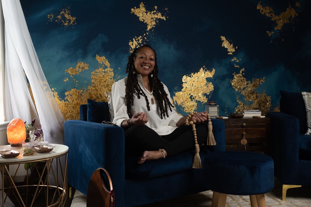 This space is a unique meeting space. It has a indoor swing that seats 2 people and 2 blue velvet chairs. Water feature with light, speakers bluetooth enabled. The wall is a stunning deep sea blue with gold leaf accents. It is perfect for photographers that want to elevate their photo shoot, videos, small meetings that command a strong impression and so much more!