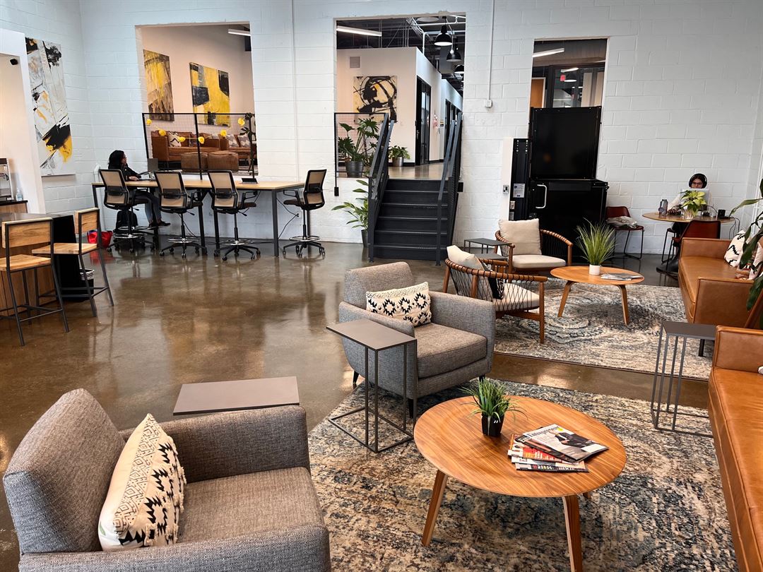 The workspace is beautifully designed for efficiency and provides inspiration on a daily basis. Venture X Richmond offers conference rooms and complimentary coffee and snacks in the cafe. Additionally, large event and lounge spaces are available for use. 1806 Summit Avenue underwent a full renovation in 2019, featuring soaring, exposed ceilings with a saw-tooth roof design that provides natural light.