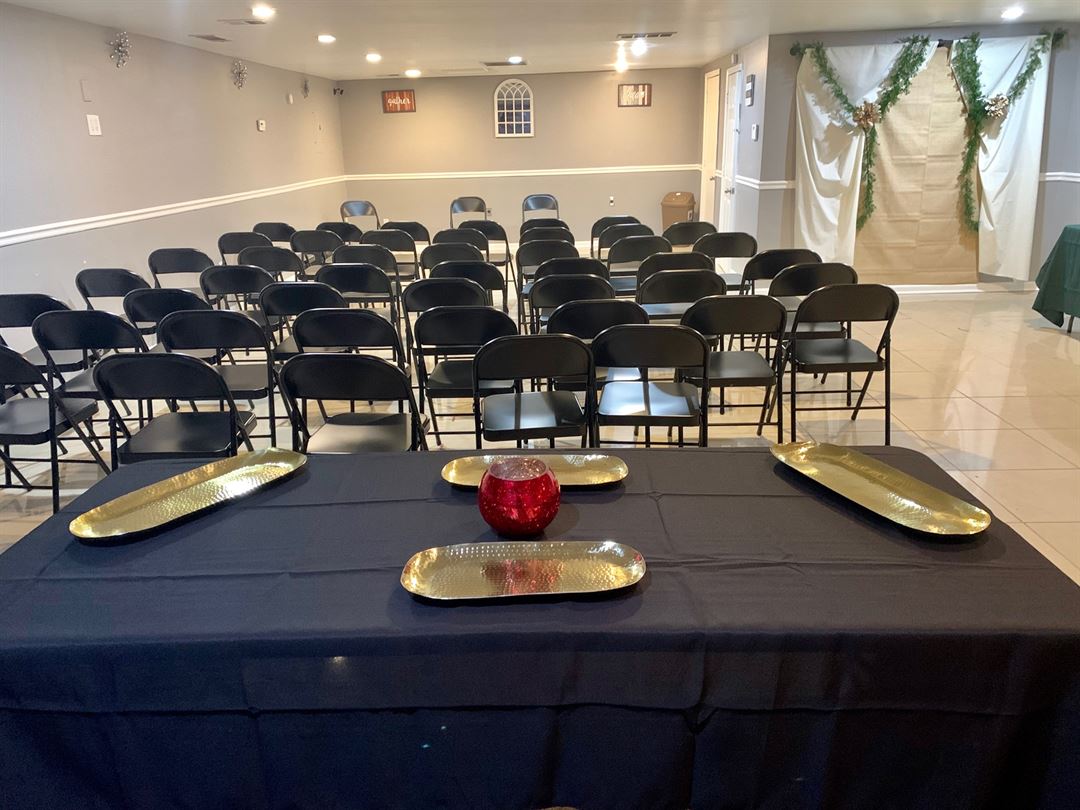 We offer: (7) 6 foot tables, 50 chairs, free off street parking, restroom, 7 different colored thick table cloths, bluetooth speaker w/ mic, table decor, & a selfie wall which can be changed if you have your own backdrop.