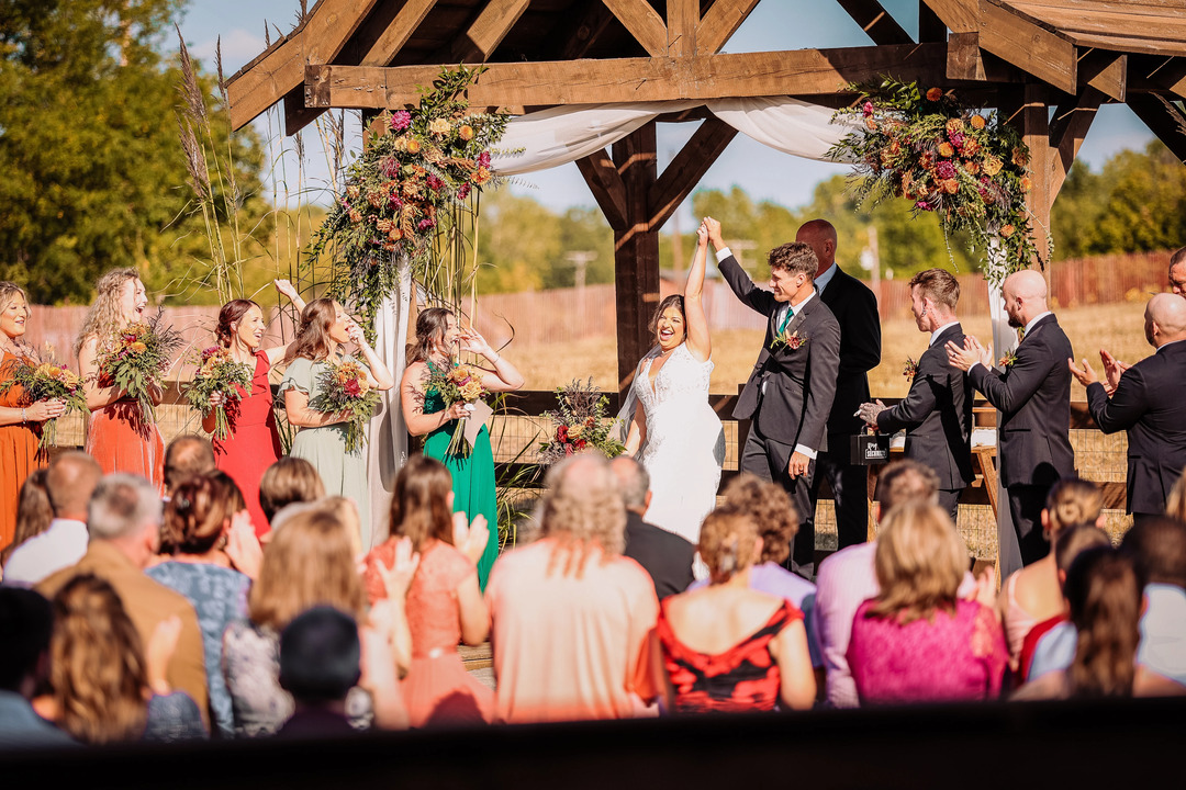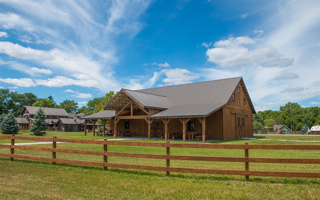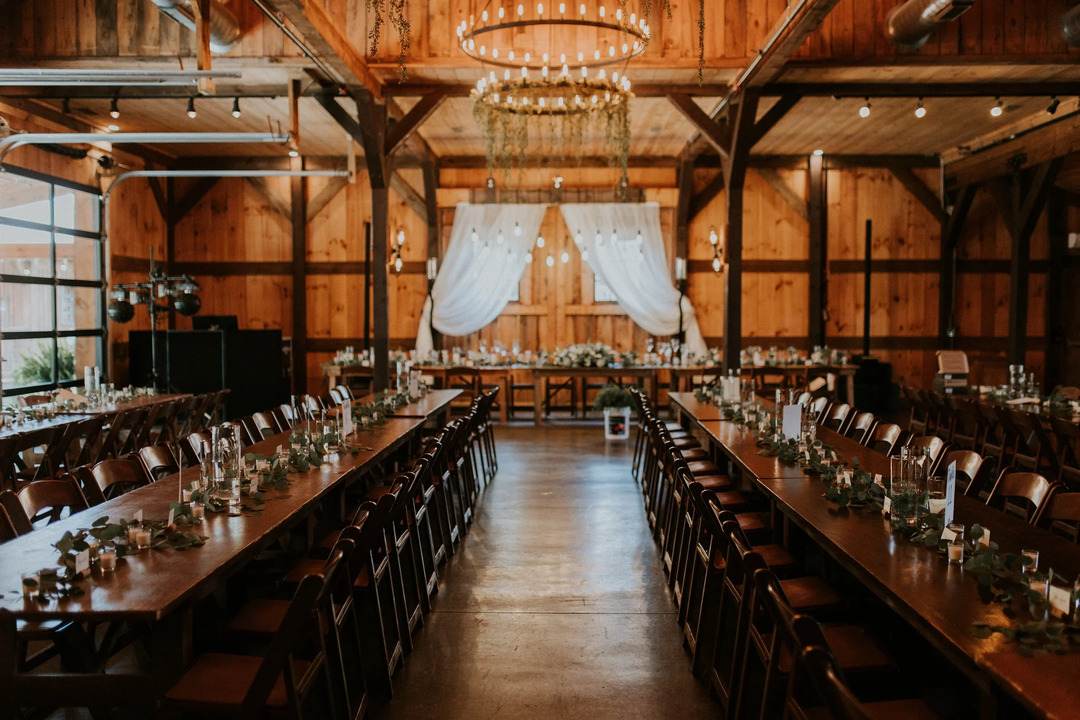 The old weathered barn wood walls and hand-carved Amish doors house 3,700 square feet of rustic elegance. Chandeliers, vintage lanterns and cafe lights brighten the space. The former dirt floor has been replaced with wood – perfect for line dances, sock hops, electric slides and chicken dances. A large bar near the entrance is the ideal spot for guests to wet their whistle. French doors lead to an additional 1,000 square-foot deck that overlooks Salt Creek. Here, among the towering oaks and picturesque farmland, guests can enjoy campfire pits while youngsters play on nearby structures.