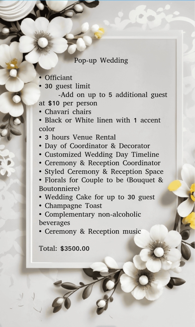 Offering a versatile elegant venue that makes your event unforgettable. Weather hosting a wedding, reception, or milestone celebration we provide a beautiful space. Seating up to 120 people with tables and chairs included. Whatever the occasion we are dedicated to it being a Charmed Experience!