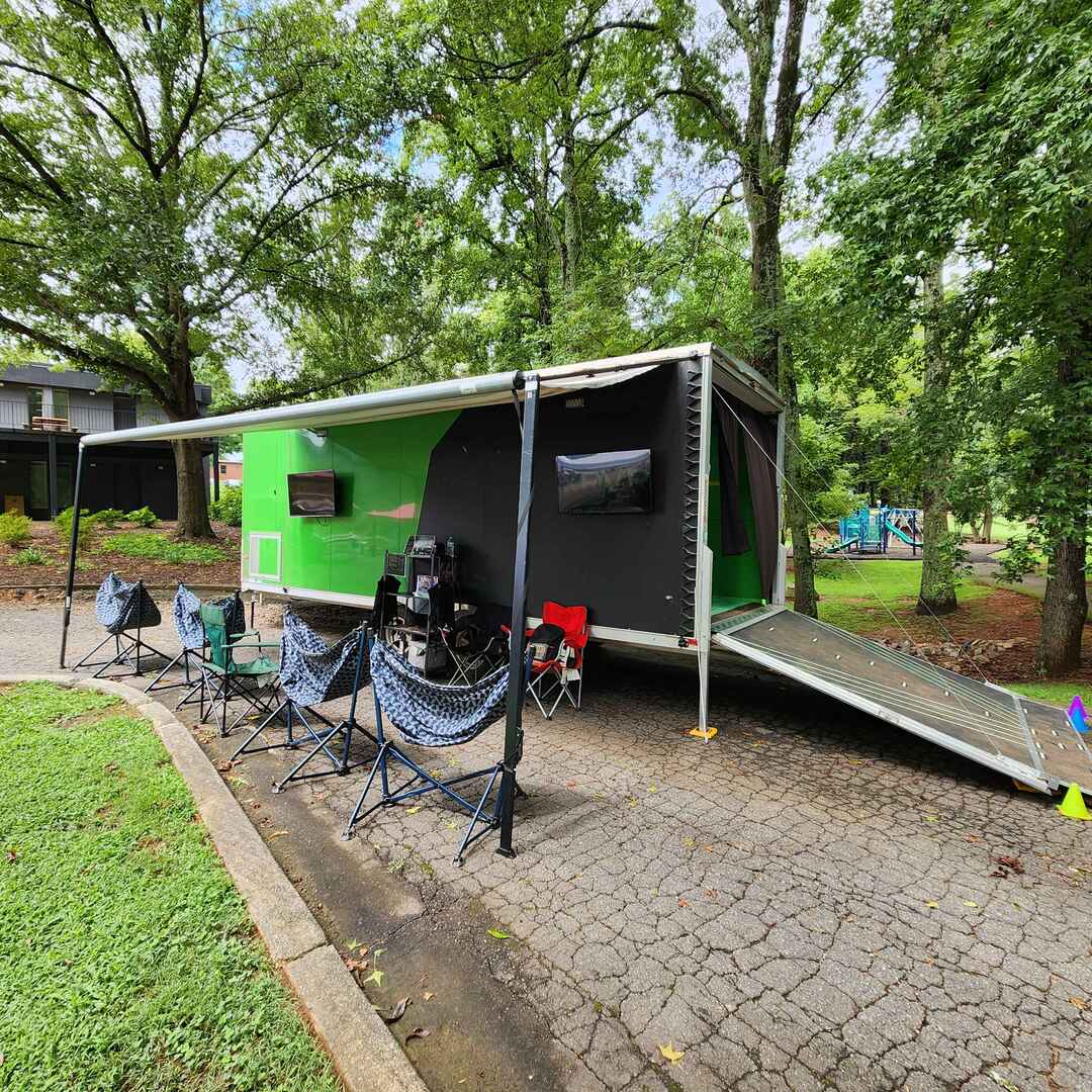 We offer both indoor and outdoor setups, including a custom 26-foot VR trailer with two play zones and a shaded social viewing area. Got a big open indoor space? We can set up a 20’x20’ arena where 1 to 6 players move freely in a shared virtual world.