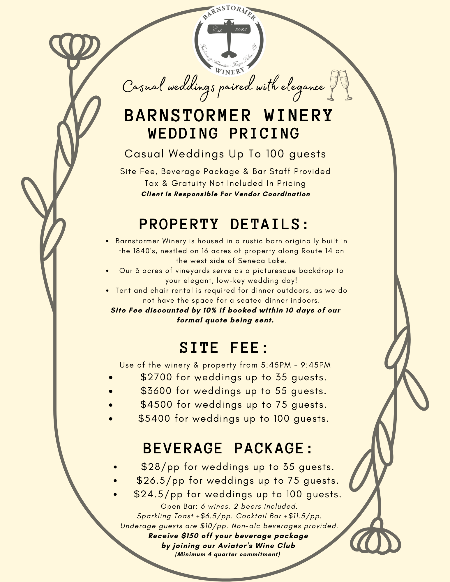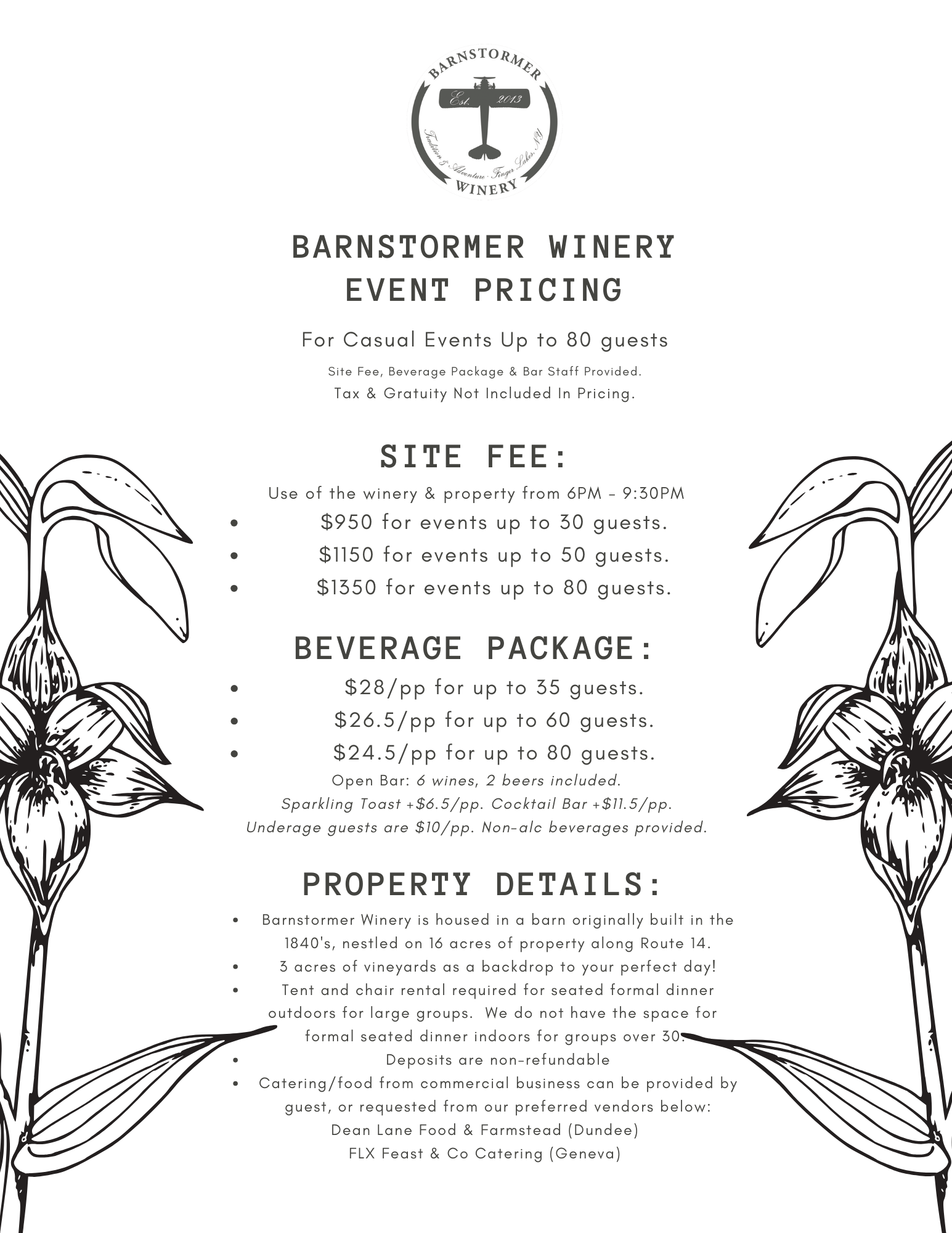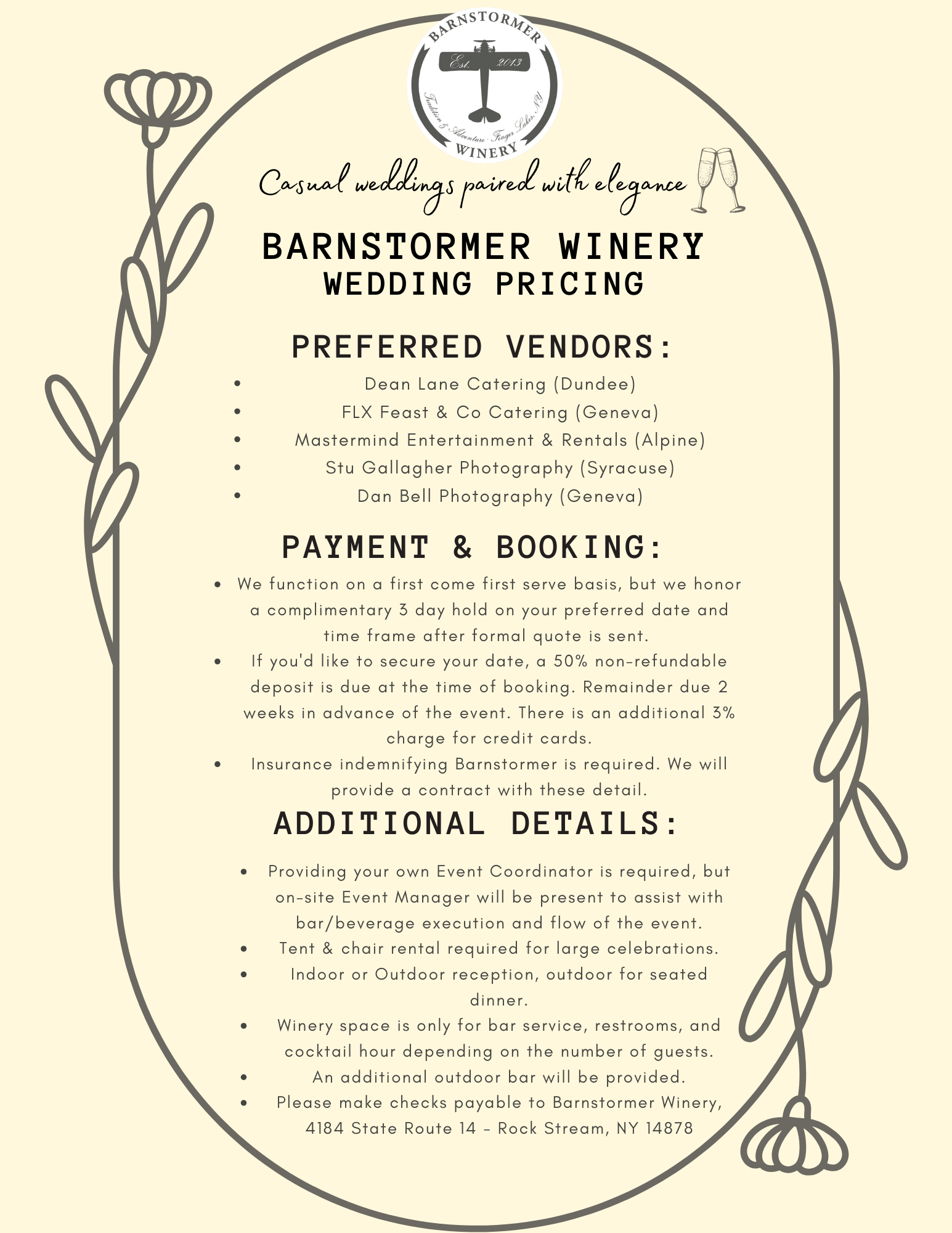 Our inside space comes with several customizable layout options in our lounge and main tasting bar. Depending on the event, we typically conduct bereave service at the main bar, offer buffet services at our smaller bar adjacent to our long, and the rest of the space serves as seating, gift tables, space for live musicians, etc.