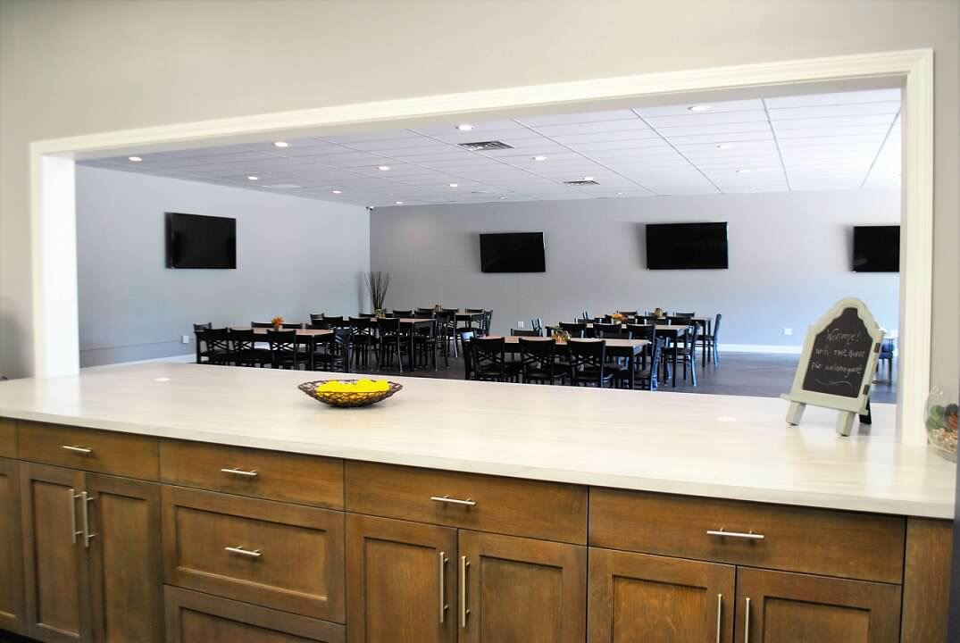 Bring your own already-prepared food and beverages; alcohol is also allowed onsite, or you may work with our preferred caterer/bartender. If you hire a caterer, they MUST remove and dispose all of the garbage with them at their own facilities to avoid additional disposal fees as we do not charge extra caterer's fees and we allow any caterer you prefer. There is a full caterer’s kitchen with commercial-grade refrigerator and freezer, and convection microwave (sorry, no open-flame cooking and no ovens). A large 12' pass-through counter has plenty of space for food presentation. Your rental includes the disposal of up to two 55-gallon garbage bags that our staff will remove. Anything above this will be charged an extra disposal fee of $25/bag, or you can remove it offsite to your own location to avoid the fee.