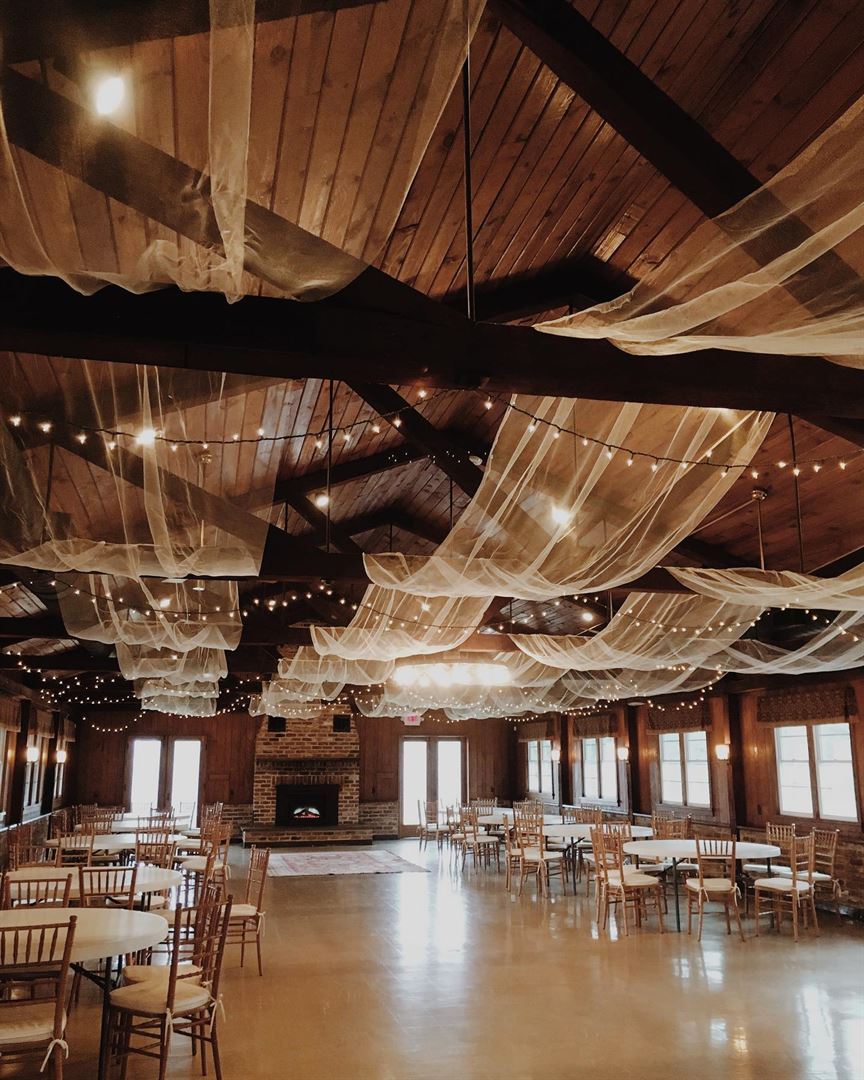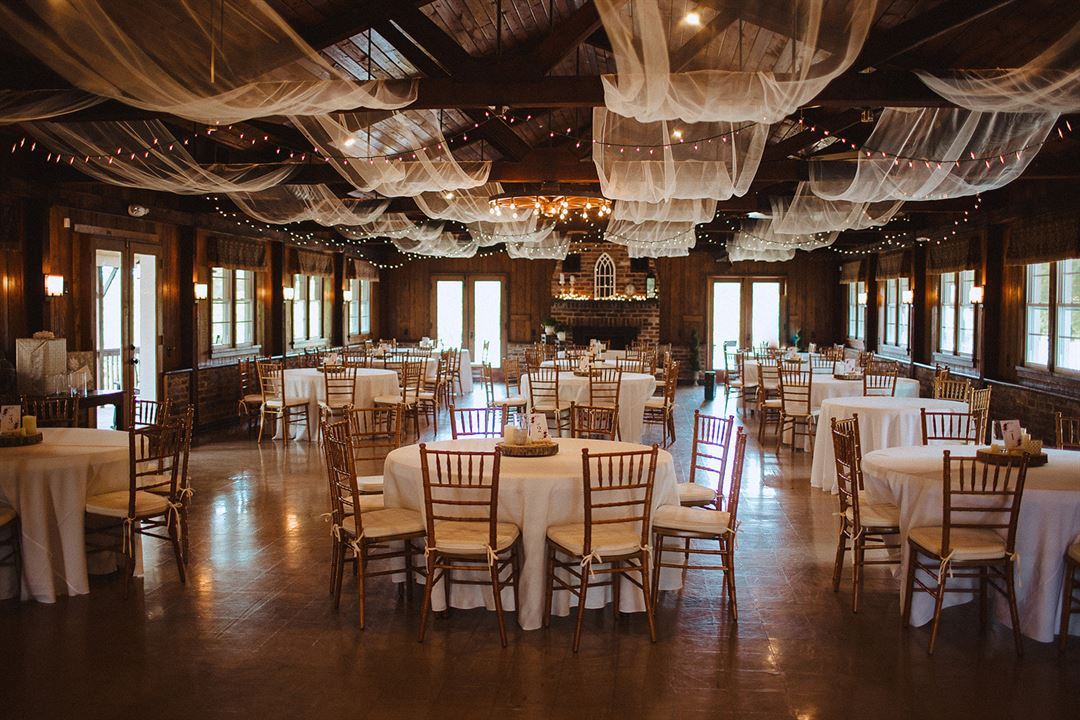 Our lodge has a retro feel with an exquisite charm. Built in the early 50s, the lodge was a retreat for the Mead Paper Company of Lynchburg. It remains today a gorgeous place for a ceremony and/or reception. Our wheel spoke chandelier and symmetrical brick hearths add to the lodge's appeal, as well as the string lights and tulle.