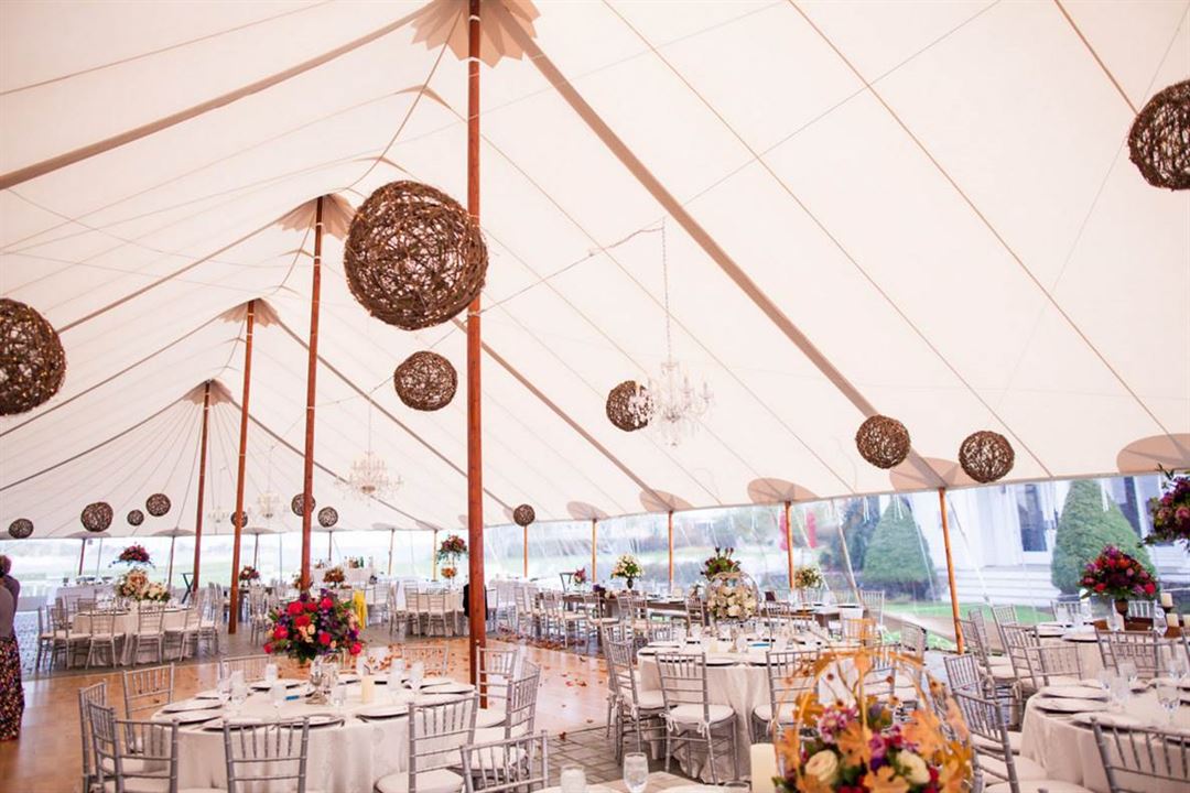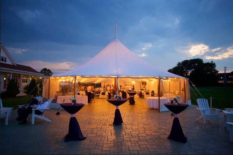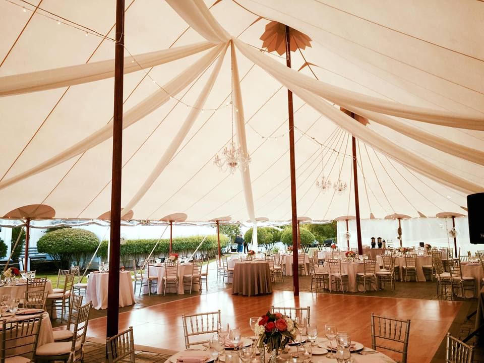 The ocean sparkles clear and crisp. The sailcloth tent sits like tall ship sails against the blue sea.
