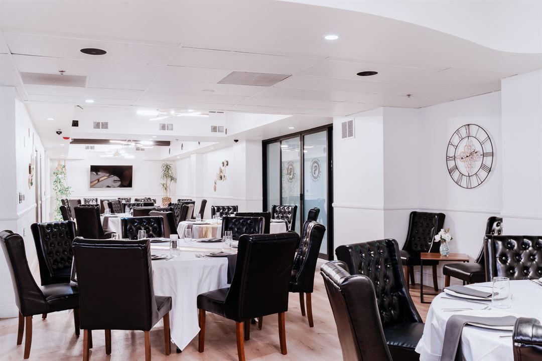 Descend to our private dining haven on the lower level, where sophistication meets technology. This refined space is outfitted with audiovisual equipment, a dedicated bar serving bespoke libations, private restrooms for comfort, and a generous capacity for up to 80 esteemed guests. The scene is set for impactful business meetings, grand celebrations, and every event in between.