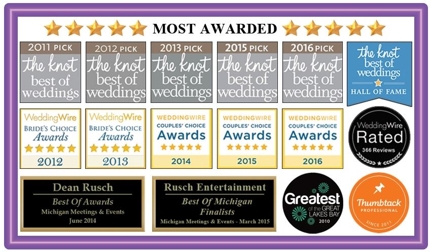 5 Star + Most FUN DJ you can find - Rusch Entertainment is Michigan's #1 FUN Wedding DJ! Since 1971, we have performed at over 90,000 successful events! We entertain everywhere in Michigan: Lansing–Flint-Bay City–Midland–Saginaw-Grand Rapids–Detroit–Kalamazoo–Thumb- Mt Pleasant - Traverse City - Ann Arbor. We have a larger music collection than any other DJ. Rusch Entertainment Is the Perfect Disc Jockey to make your reception amazing! At Rusch Entertainment, our Classy & Fun entertainers will keep your guests dancing and make your event "the party of a lifetime"! We entertain at every major banquet hall and offer different packages on our award winning disc jockey service! It is my sincere hope that you will give me a Call to discuss your ideas on the music.