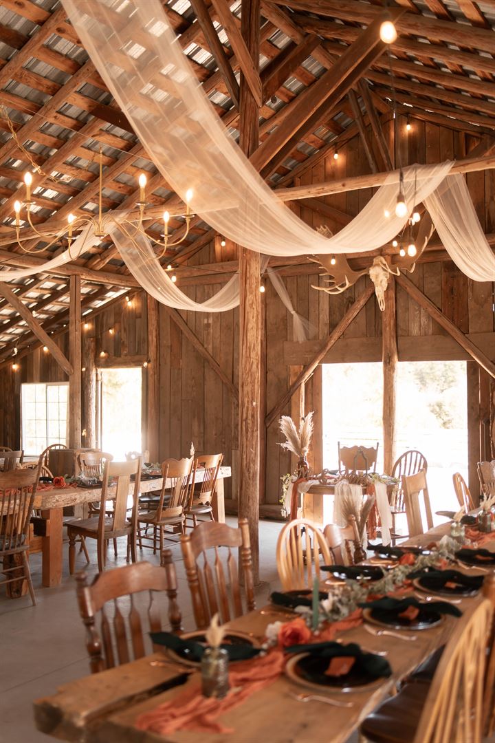 Gather and dine in our 70 year old tamarack framed event barn adorned with thick slab pine tables milled on the ranch. Brides have use of a 2 bedroom bridal suite, en suite bathroom, and a large covered patio with a dining table. The Gents can enjoy the 12'x24' log cabin as they prepare for the main event. Leather sofa and seating with patio access for celebratory cigars.