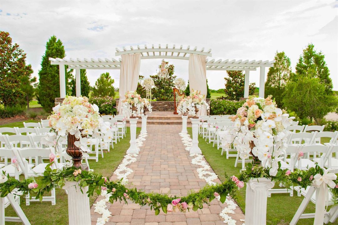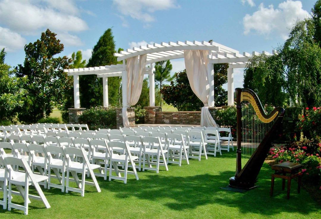 Our amazing venue, The Royal Crest Room, has it all! The elegant White Ballroom and exquisite outdoor ceremony location – Magnolia Garden -- sit on 400 acres of lush grounds featuring a grand stone bridge, a waterfall bridge, authentic British phone booths, Southern-charm aged oak trees, beautiful flowers, perfectly manicured lawns, and Heart Lake.