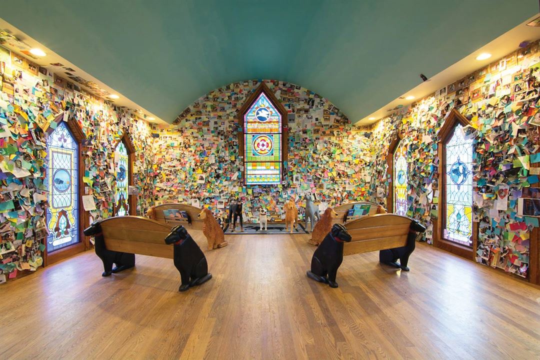 Dog Mountain is unlike any other place on earth. From the stunning mountain vistas, wildflower meadows, picturesque ponds, and miles of wooded hiking trails, there is no shortage of natural beauty. The iconic work of American folk artist, Stephen Huneck, can be found throughout the 150 acre property, turning the landscape into an interactive artist installation that's a feast for the eyes and an experience for the soul. Explore the vast property and you will come across wooden sculptures of birds, benches shaped like Labradors, stone obelisks with winged angel dogs and our stunning, world-famous Dog Chapel.