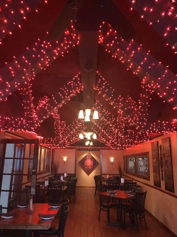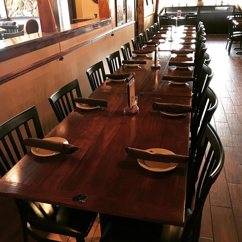 Our multi-level dining room with cozy lighting is full of wonderful detail. From the exposed brick to the wall of live plants, the giant wine tower to the roaring fireplace out on the deck, there is plenty to catch the eye, including gorgeous sunsets over the city views of downtown St. Joe.
