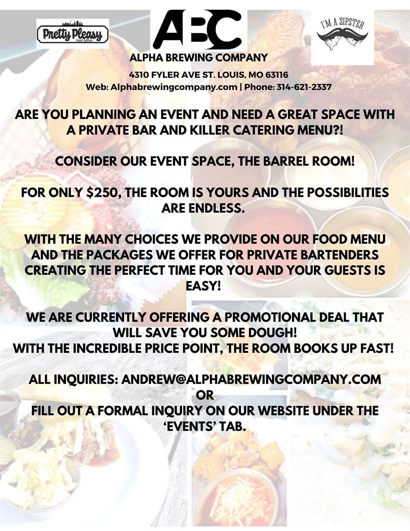 Alpha Brewing Company is proud to offer packages for every budget, for every event! A wedding rehearsal dinner, a baby shower or your best friend’s surprise birthday, we can do it all!