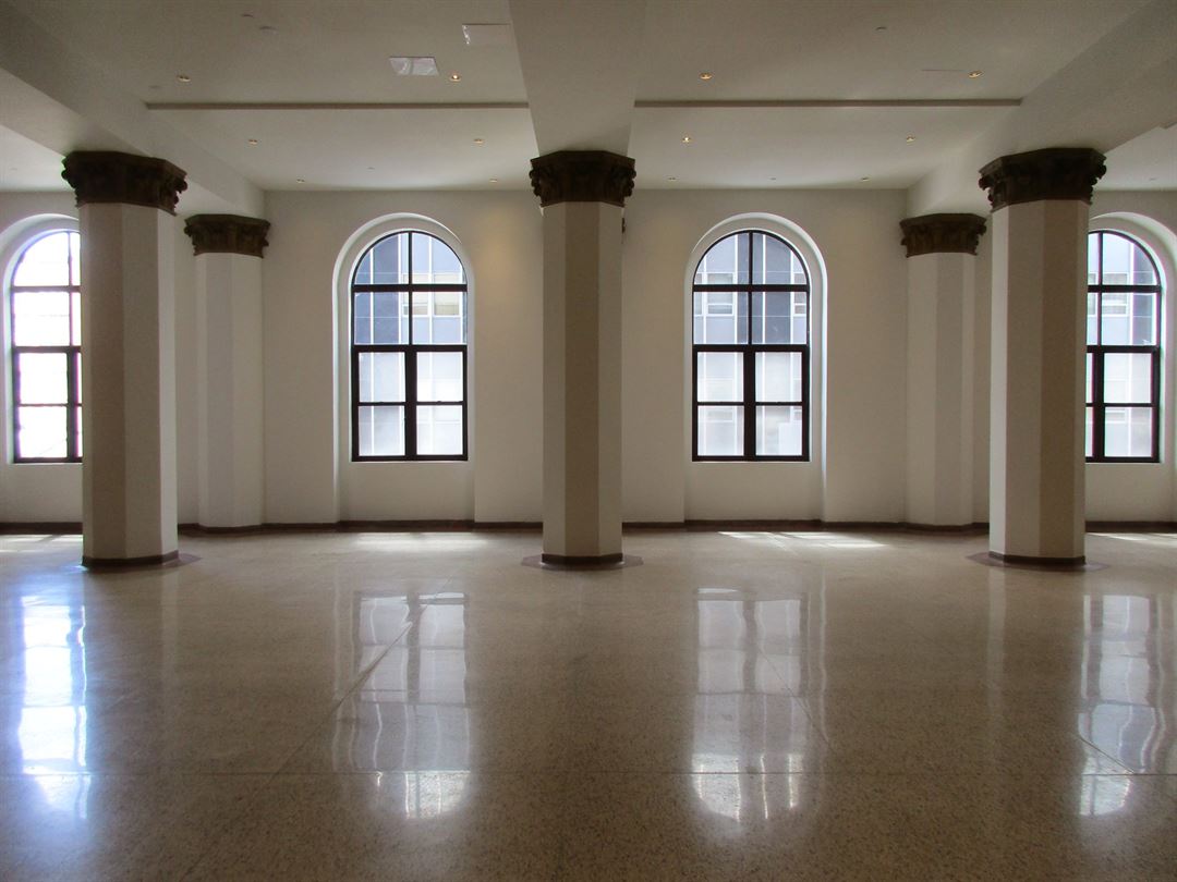 The Grand Ballroom is on the 16th floor at the top of the building. This is an open ballroom unobstructed by columns and can accommodate up to 400 guests. It features stunning arched windows that fill the room with natural light and provides your guests with spectacular views of historic downtown St. Louis. It also features gorgeous wood floors, house sound and mood lighting systems.