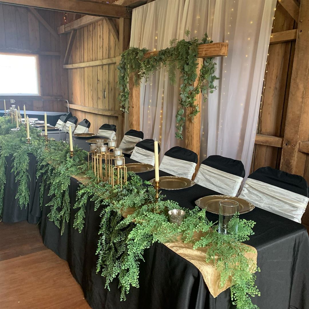 There is ample room for different table configurations, catering, buffet lines, and DJ equipment. Two restrooms are available, as well as a discrete catering preparation area with plenty of outlets and a sink. An industrial size refrigerator is available for you or your caterer to use. There are two entrances, one to the lower outside seating area and the main entrance that is handicap accessible. Your guests are welcome to roam the grounds around the barn to relax and talk or stay inside and dance the night away.