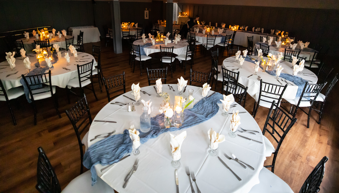 Adaptable indoor event room that suits weddings, parties, and ceremonies of all types.