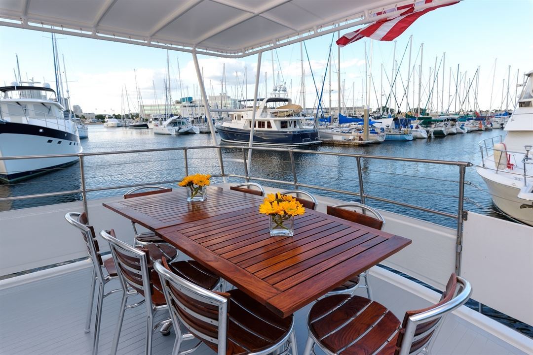 The Smooth C's offers seating for 12 on the bow, 8 on the covered aft deck, 3 on the bridge, and up to 12 in the air-conditioned salon, you'll enjoy a private yacht charter experience at an affordable price. The salon features wrap-around seating for 6 plus two leather recliners. The galley dinette offers additional seating for 6. The galley has a full size refrigerator/freezer, microwave, and plenty of counter space. There is also a spacious restroom inside.