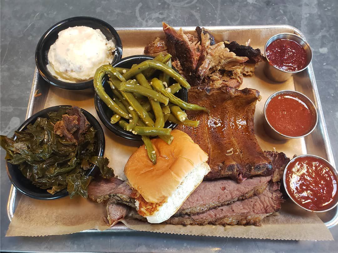 BBQ restaurant right in the heart of the Grand Central District! Serving delicious smoked meats, award winning mac and cheese, and all your favorite comfort sides and apps. We cater onsite or offsite events of any size. For onsite events, we offer a full bar with a focus on bourbon, several beers on tap, and can offer a private outdoor bar for your event. We have a large covered patio featuring several large picnic tables for big groups. 4 shuffleboard courts offer endless fun for parties or families, and it's free to play! We also have indoor seating available for smaller groups up to 50 people. This is a great space to host your rehersal dinner, graduation party, birthday, anniversary, office meeting, or any other event or celebration!