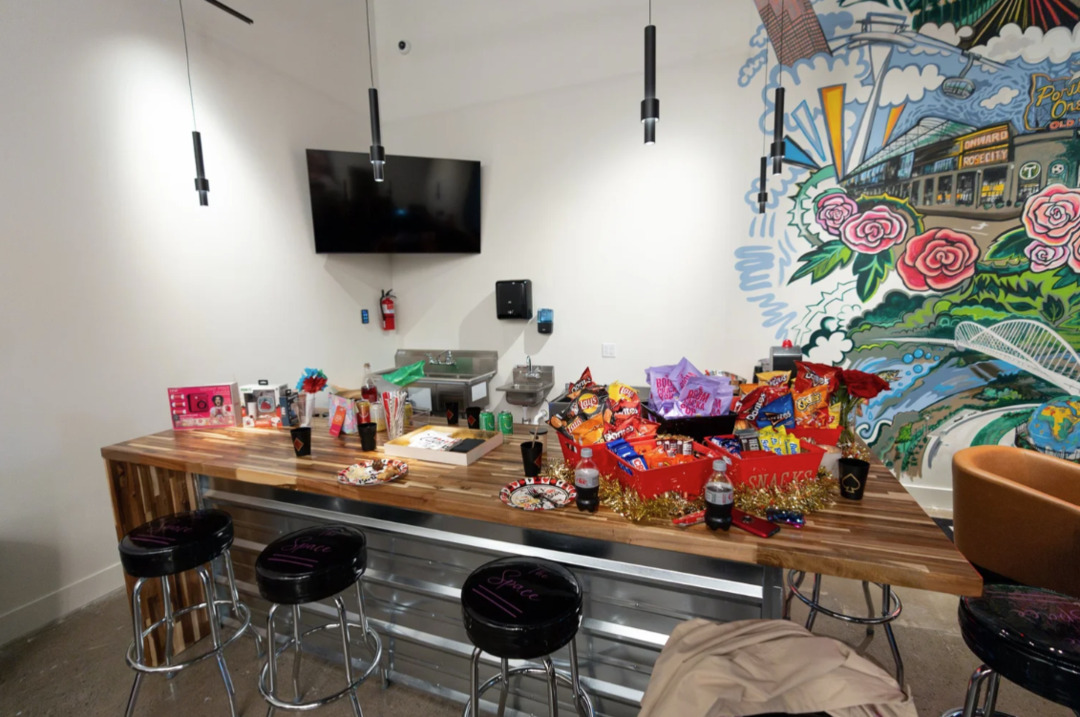 We offer flexible layouts, tables and seating, and lounge furniture. Our space can comfortably accommodate gatherings from 10 to 100 guests, with customizable packages that include setup, cleanup, and add-on amenities like photo booths and high-top tables.