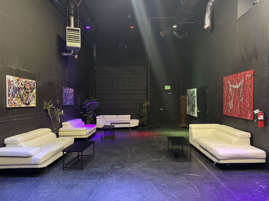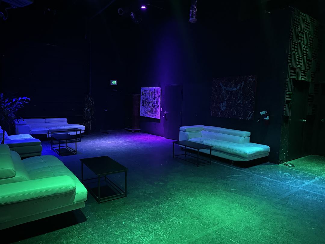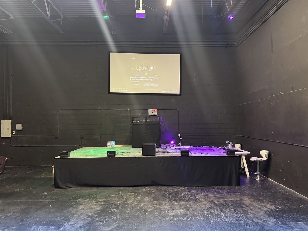 The space features a stage, stage lights, sound system, screen + projector, and lounge furniture.